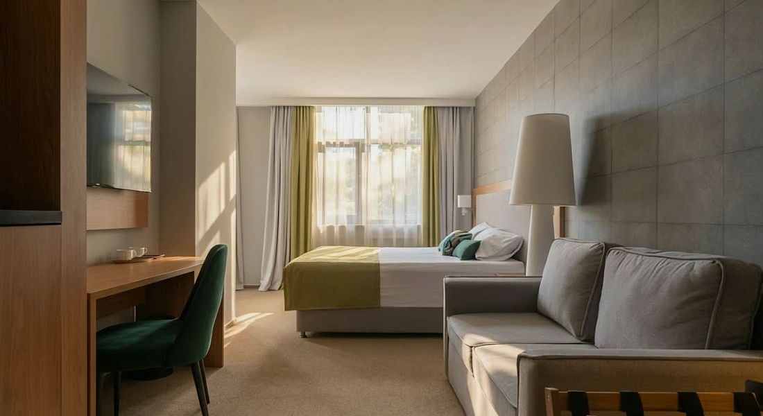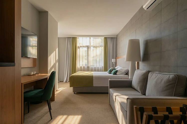 Standard superior room with an area of 26 sq.m. for comfortable accommodation of two or three people. The room has one double bed and a chair-bed.