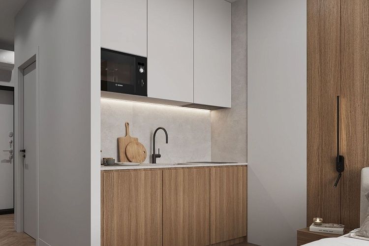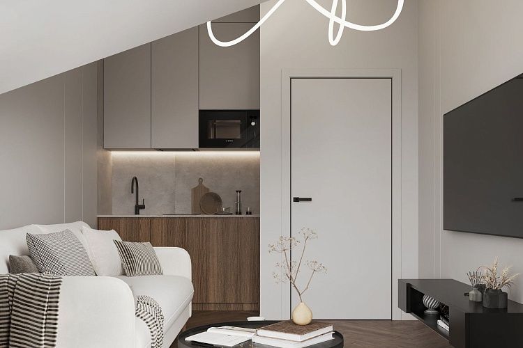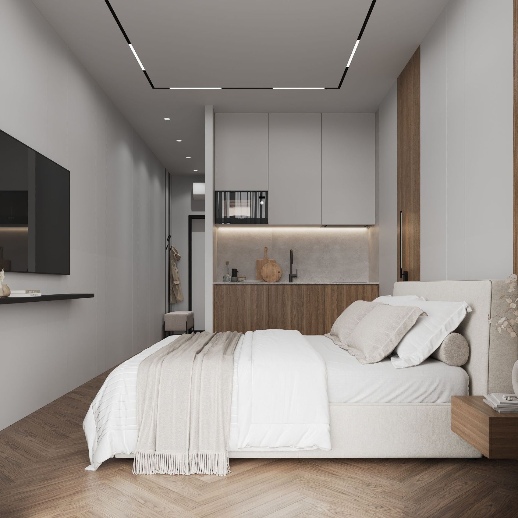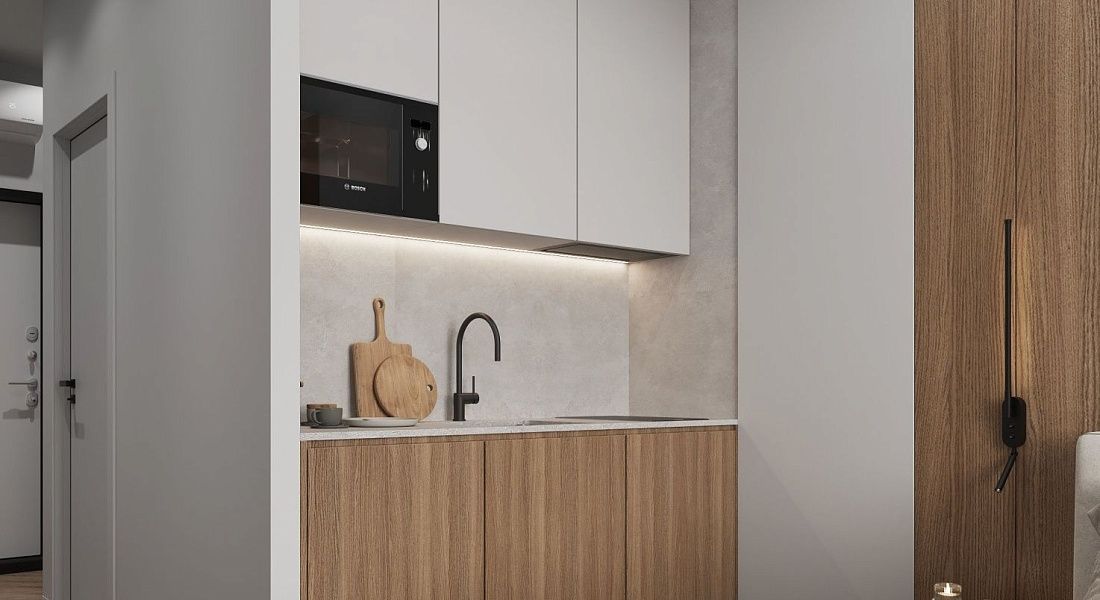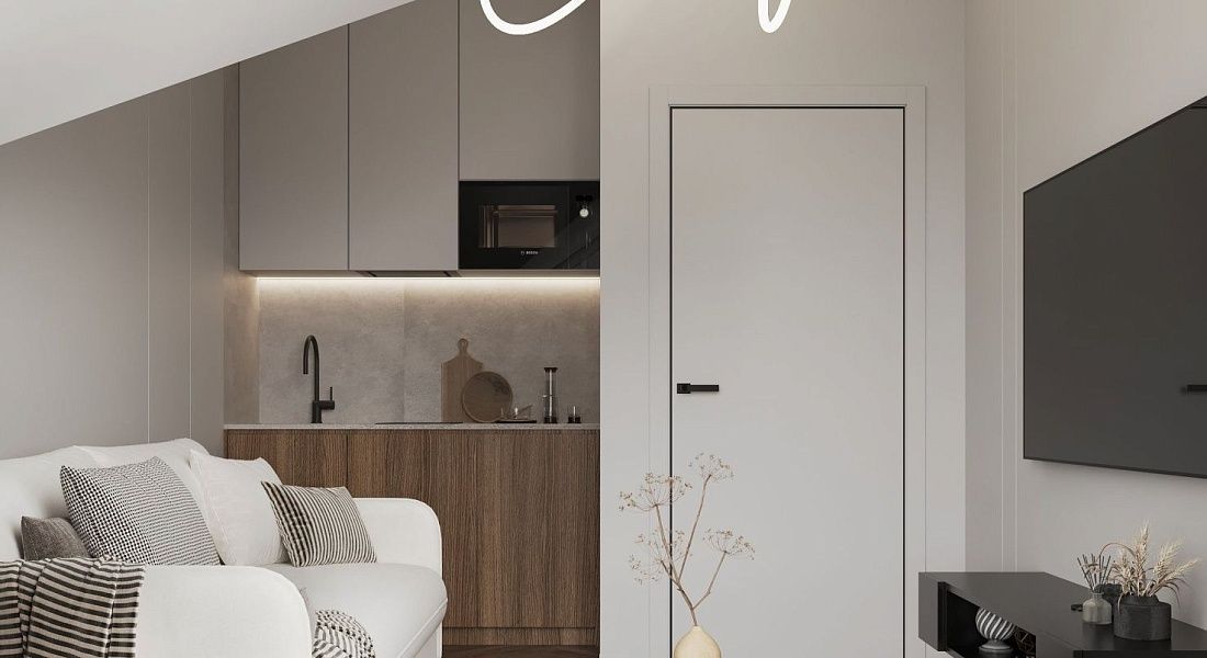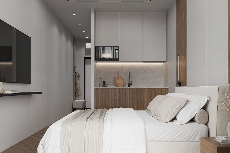 A cozy apartment with a kitchen-living room and a separate bedroom with a king-size bed and a balcony.