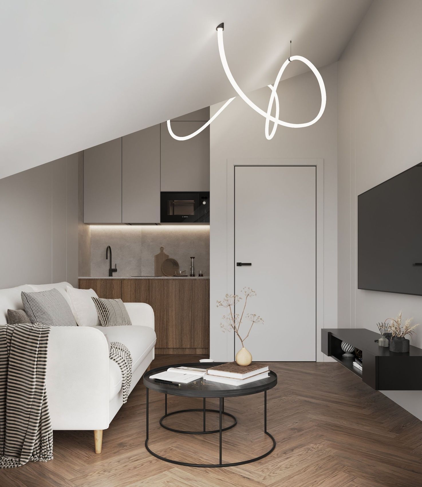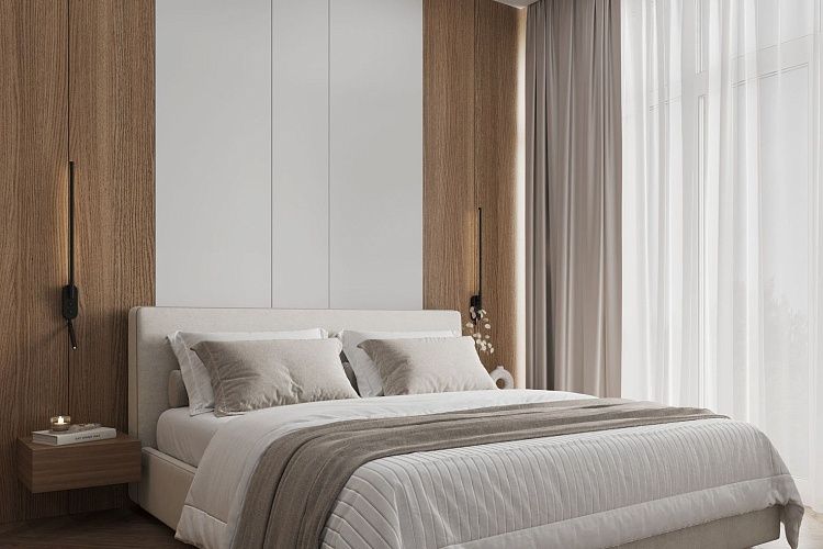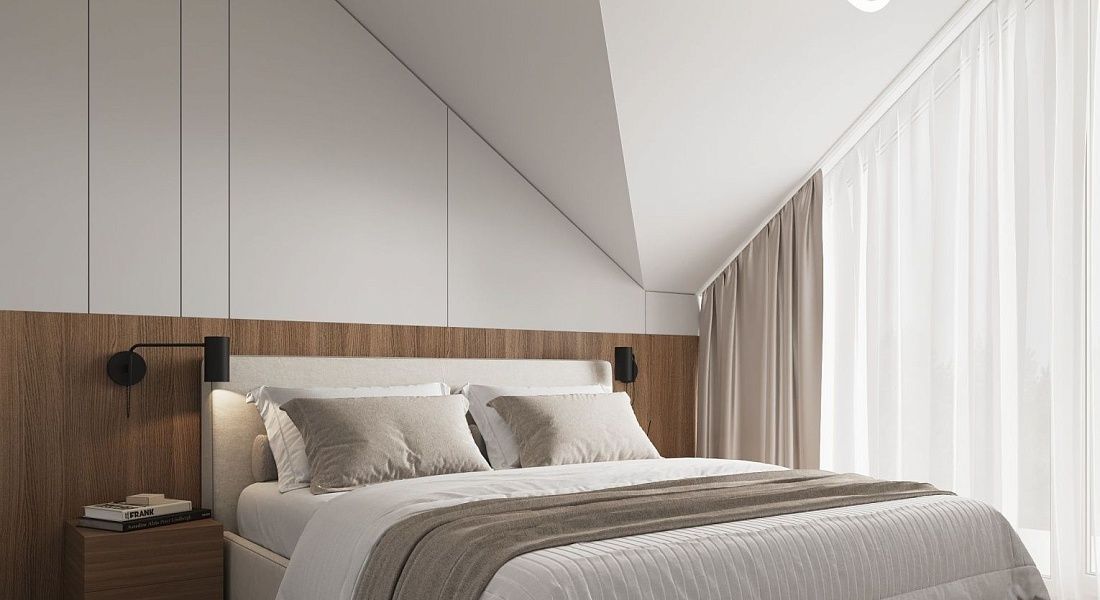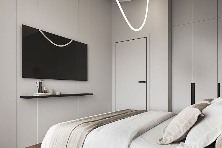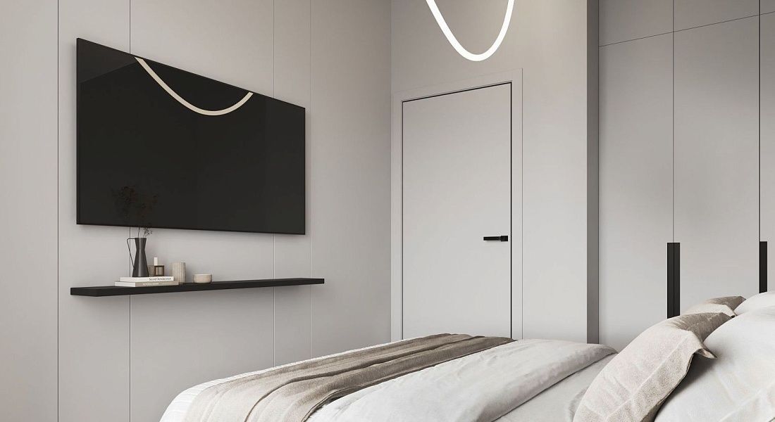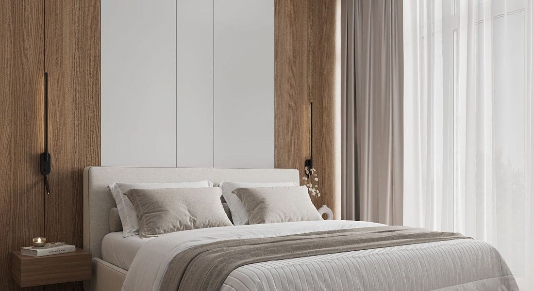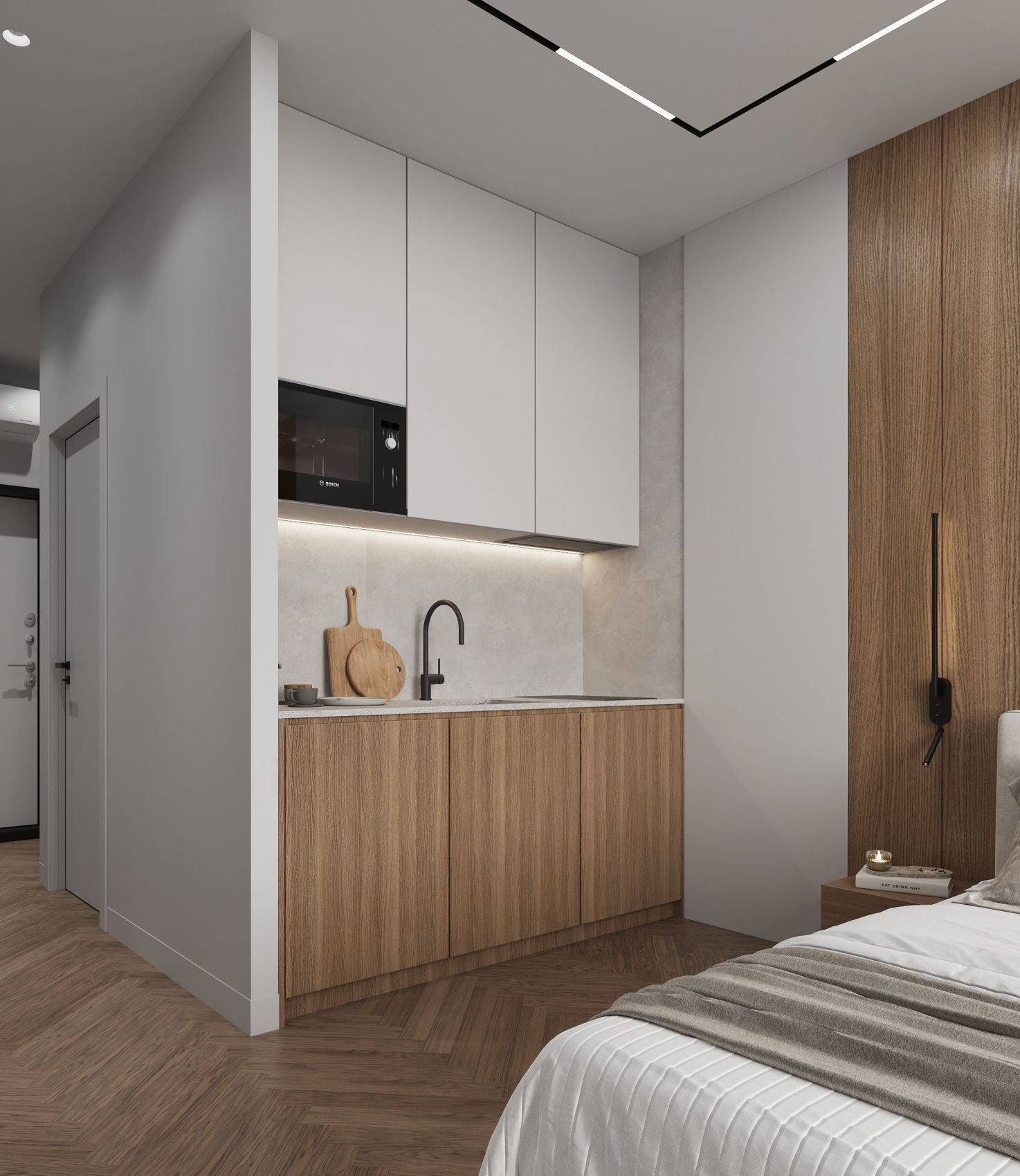 A cozy apartment with a kitchen-living room and a separate bedroom with a king-size bed and a balcony.