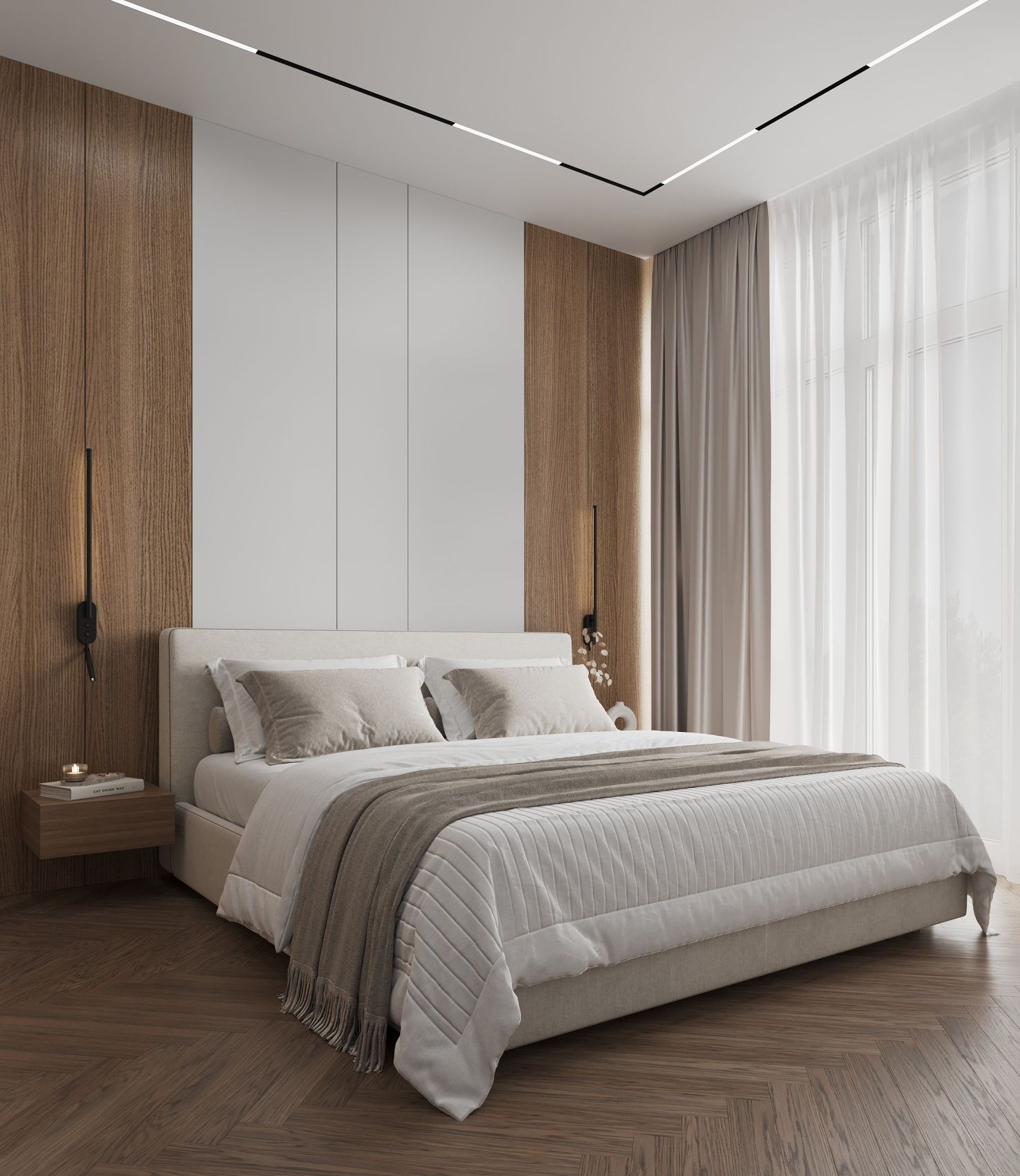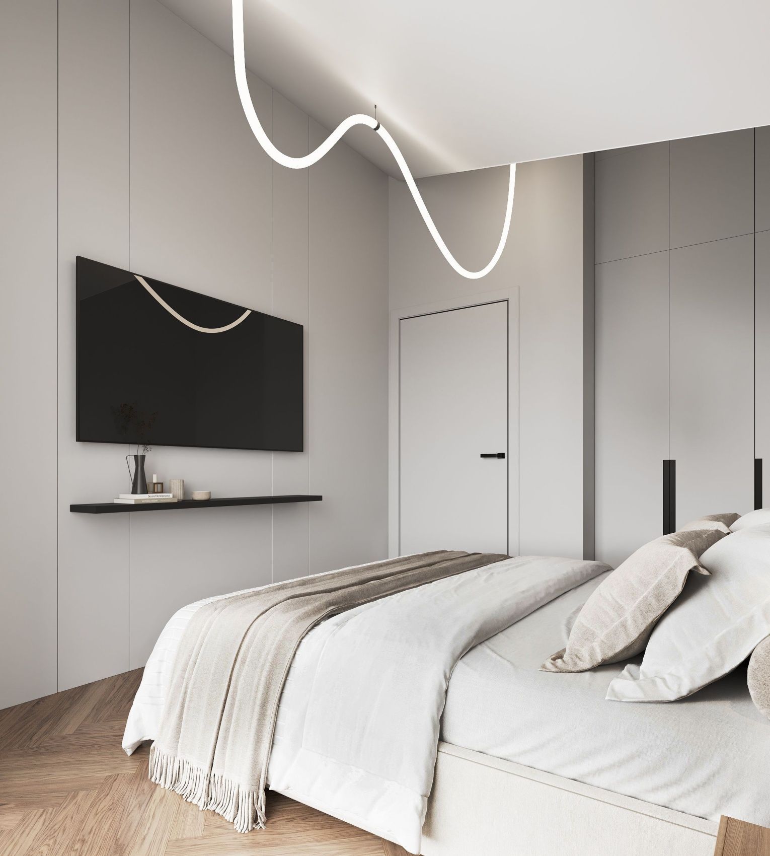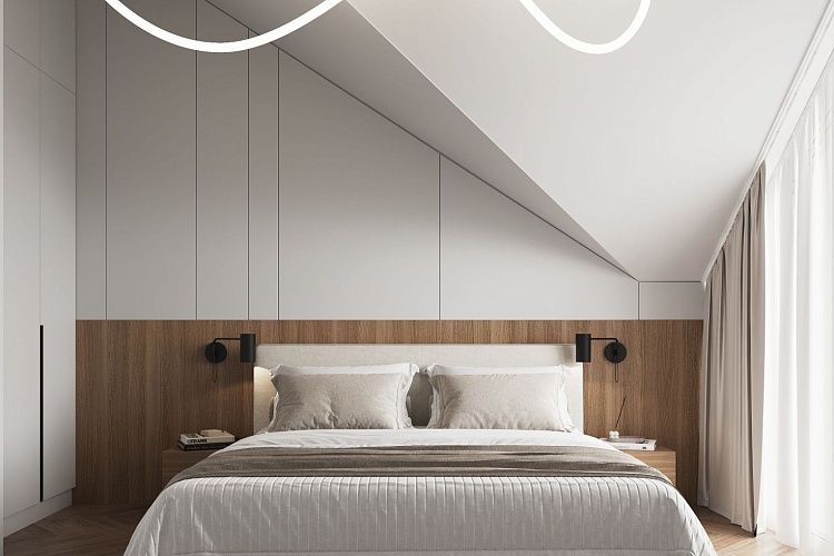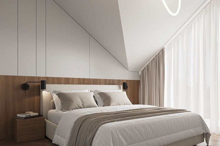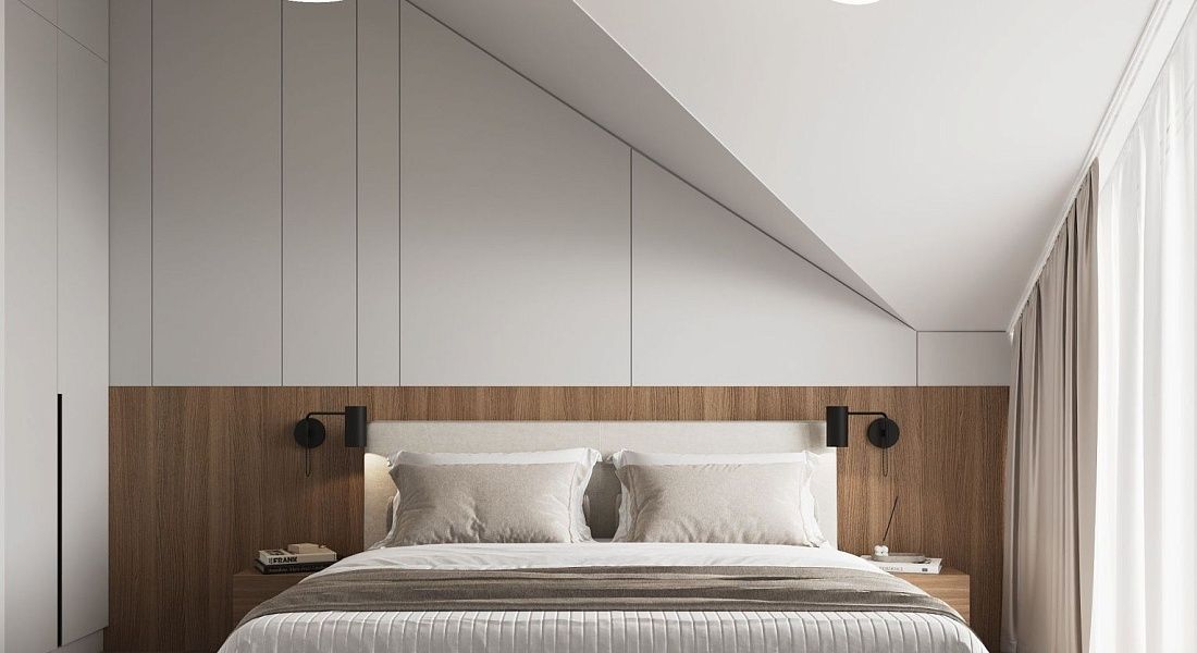 A cozy apartment with a kitchen-living room and a separate bedroom with a king-size bed and a balcony.