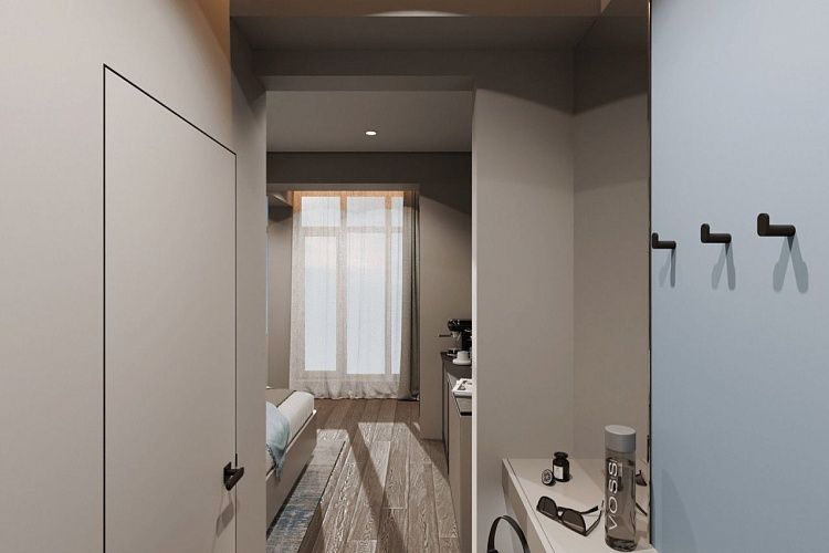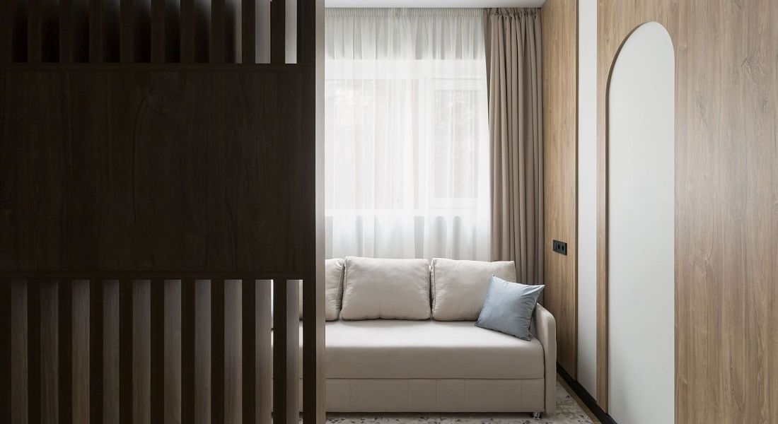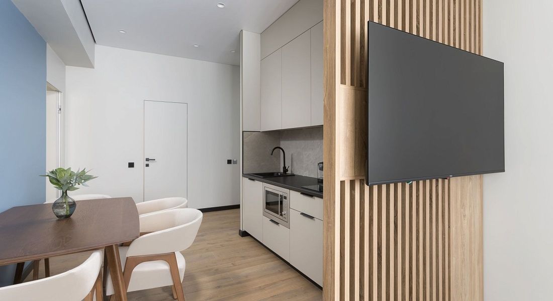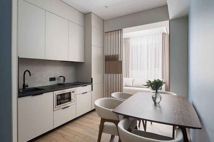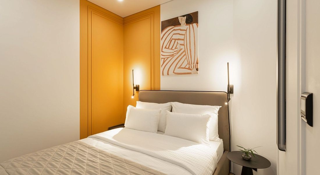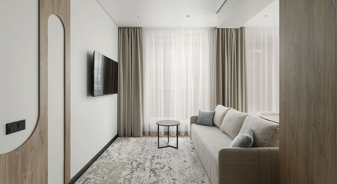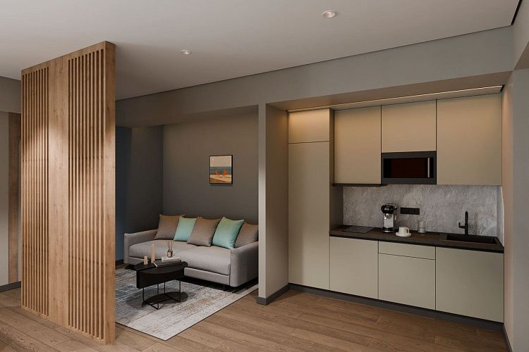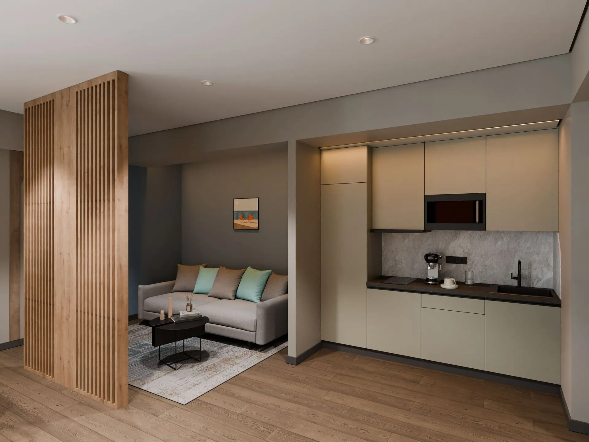 A bright room for 2 guests with a zoning partition between the bedroom and the living area. With a fully equipped kitchen.