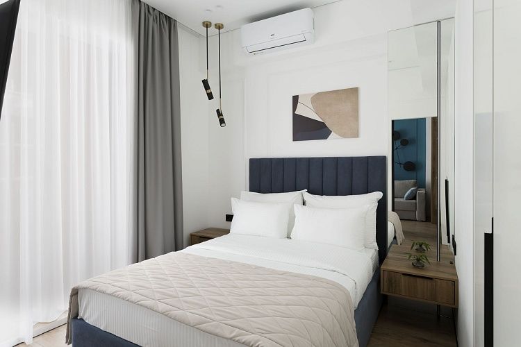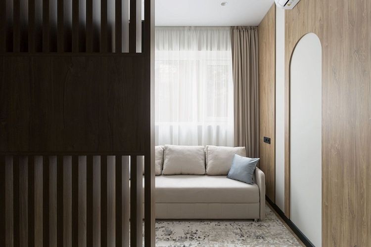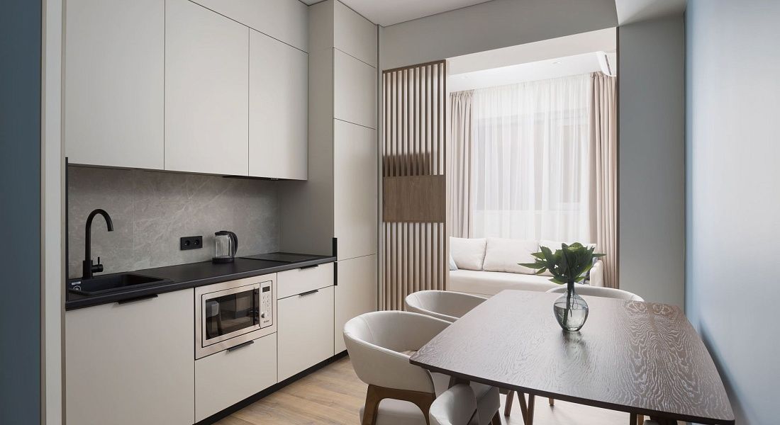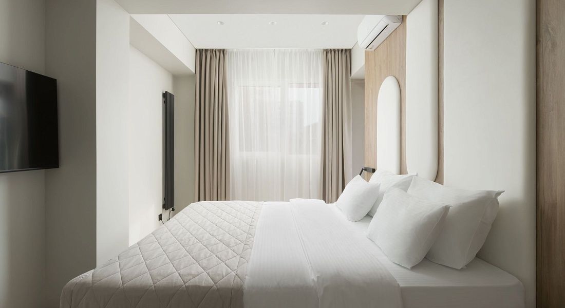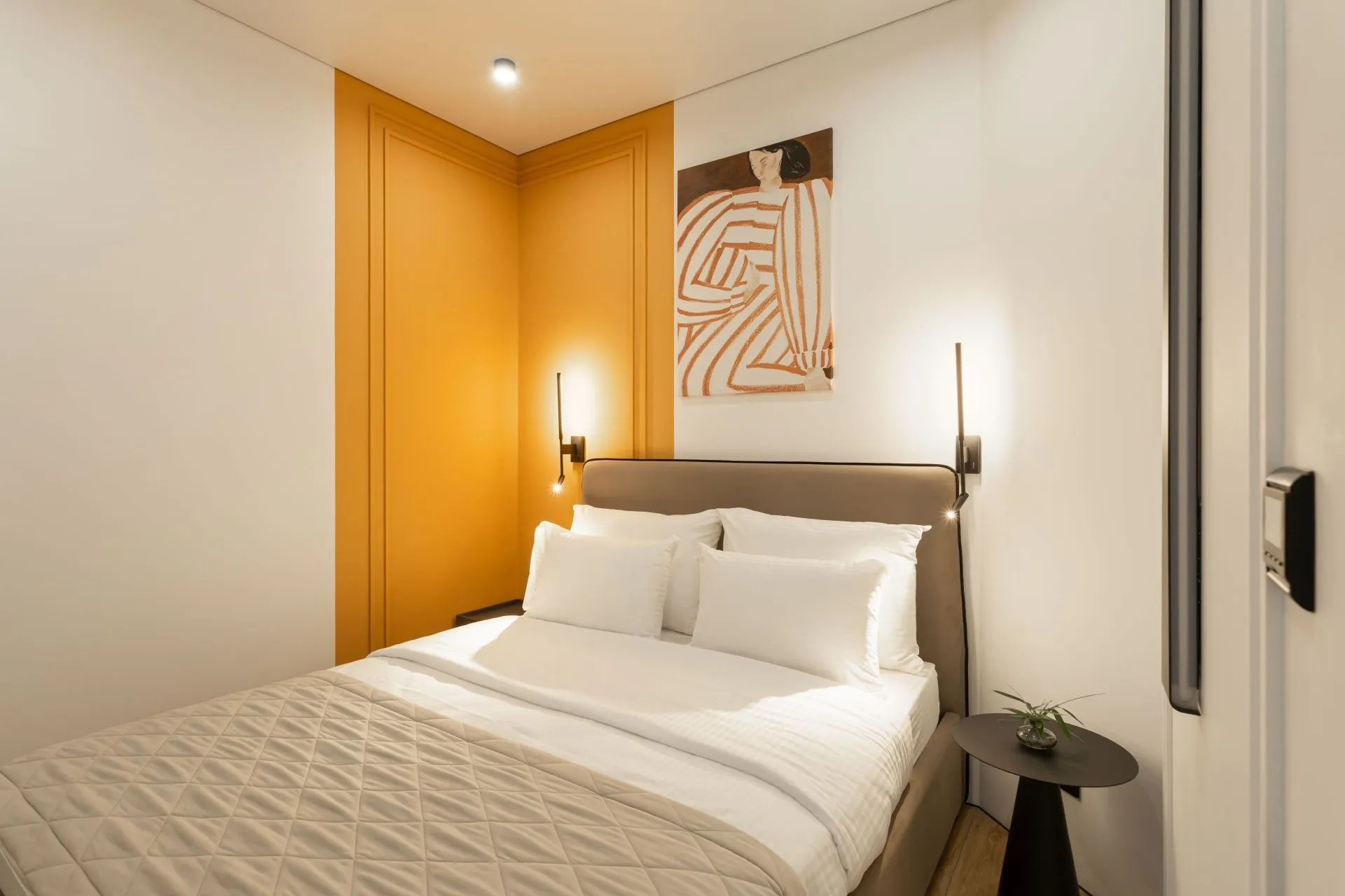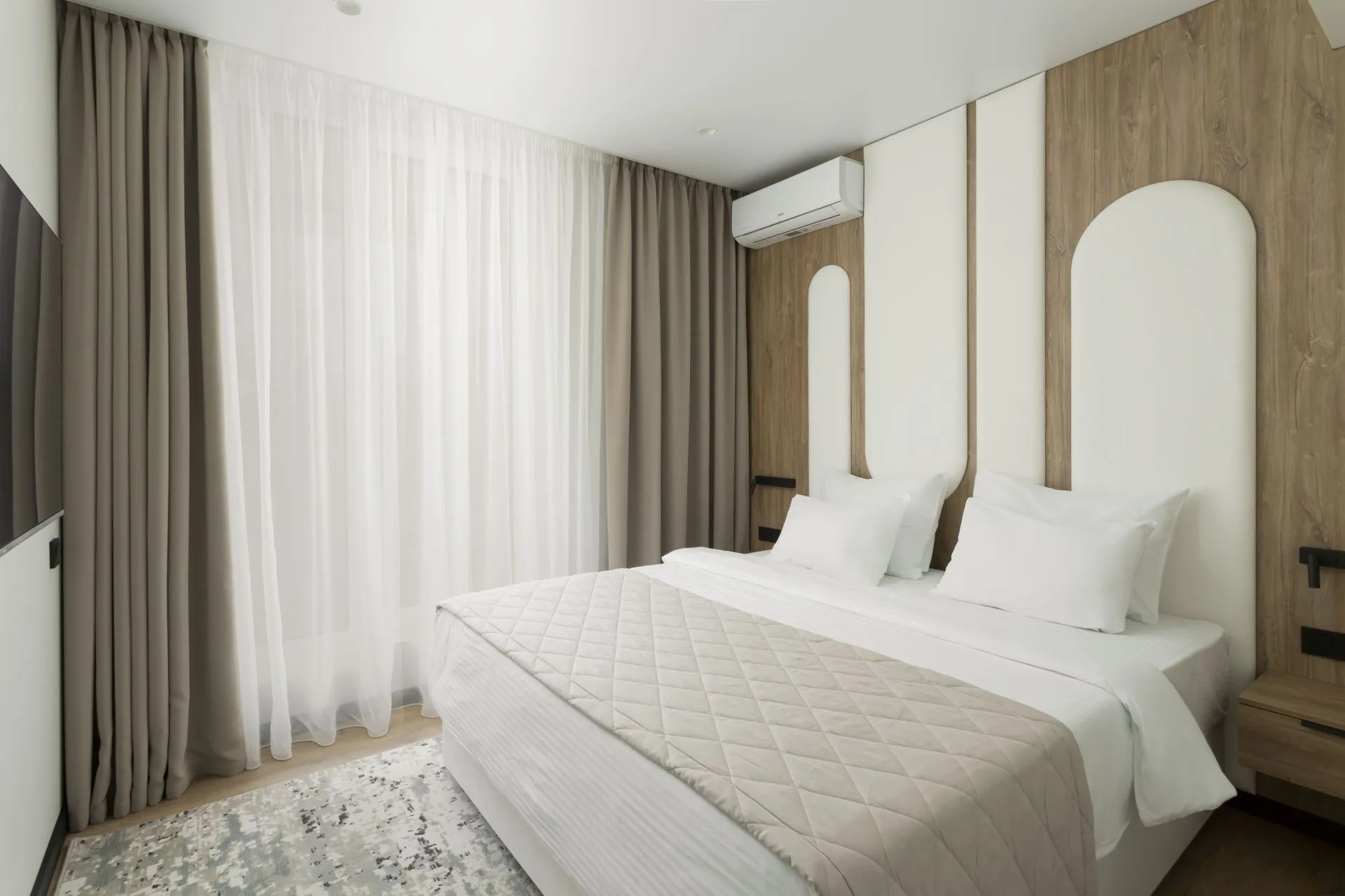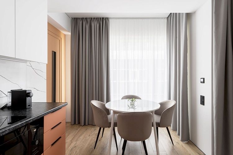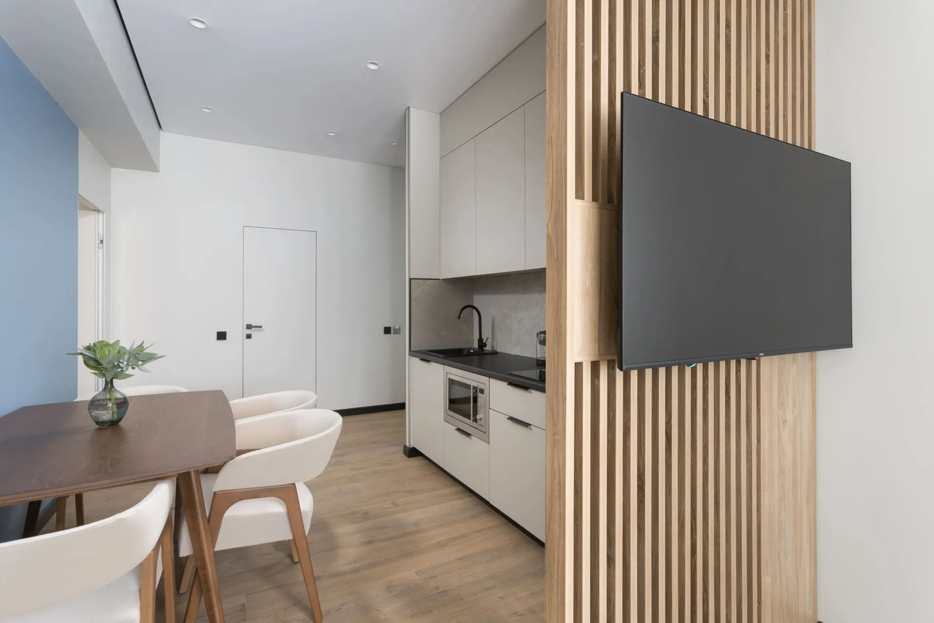 A bright room for 2 guests with a zoning partition between the bedroom and the living area. With a fully equipped kitchen.