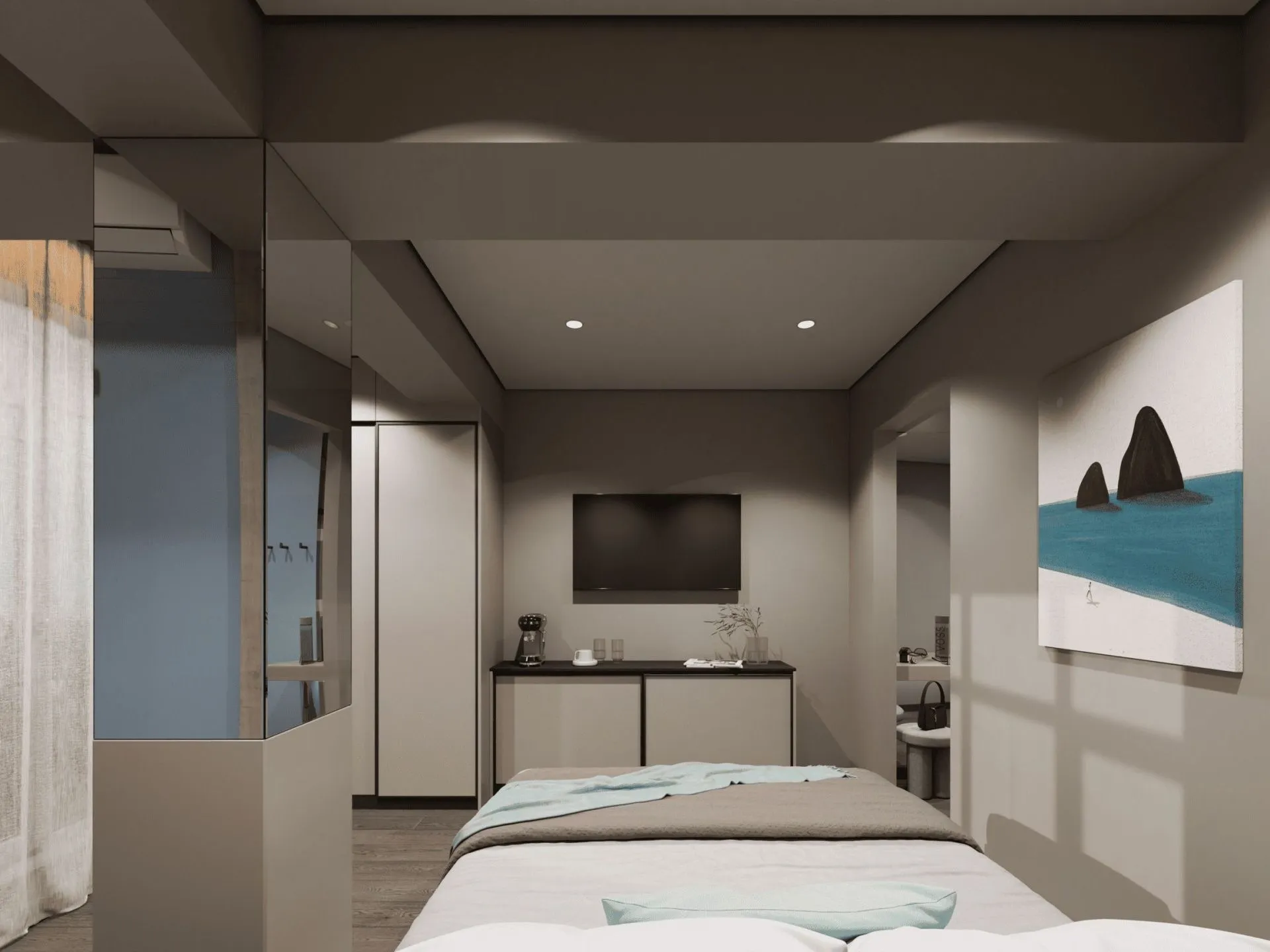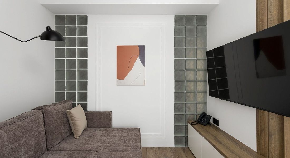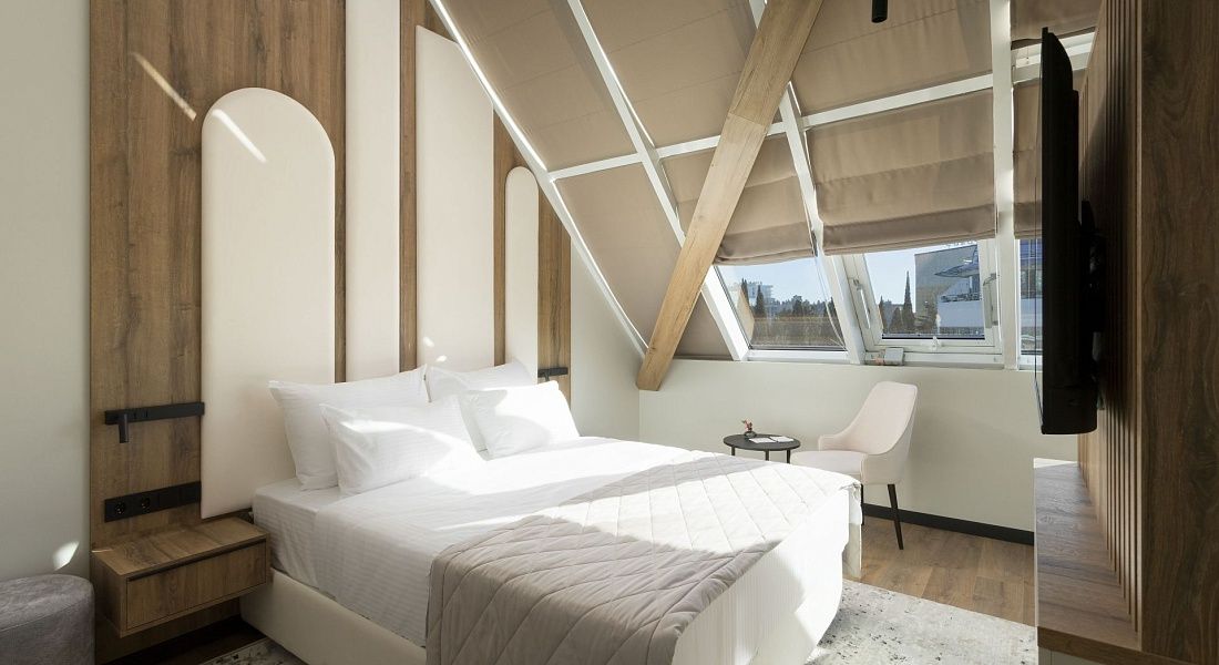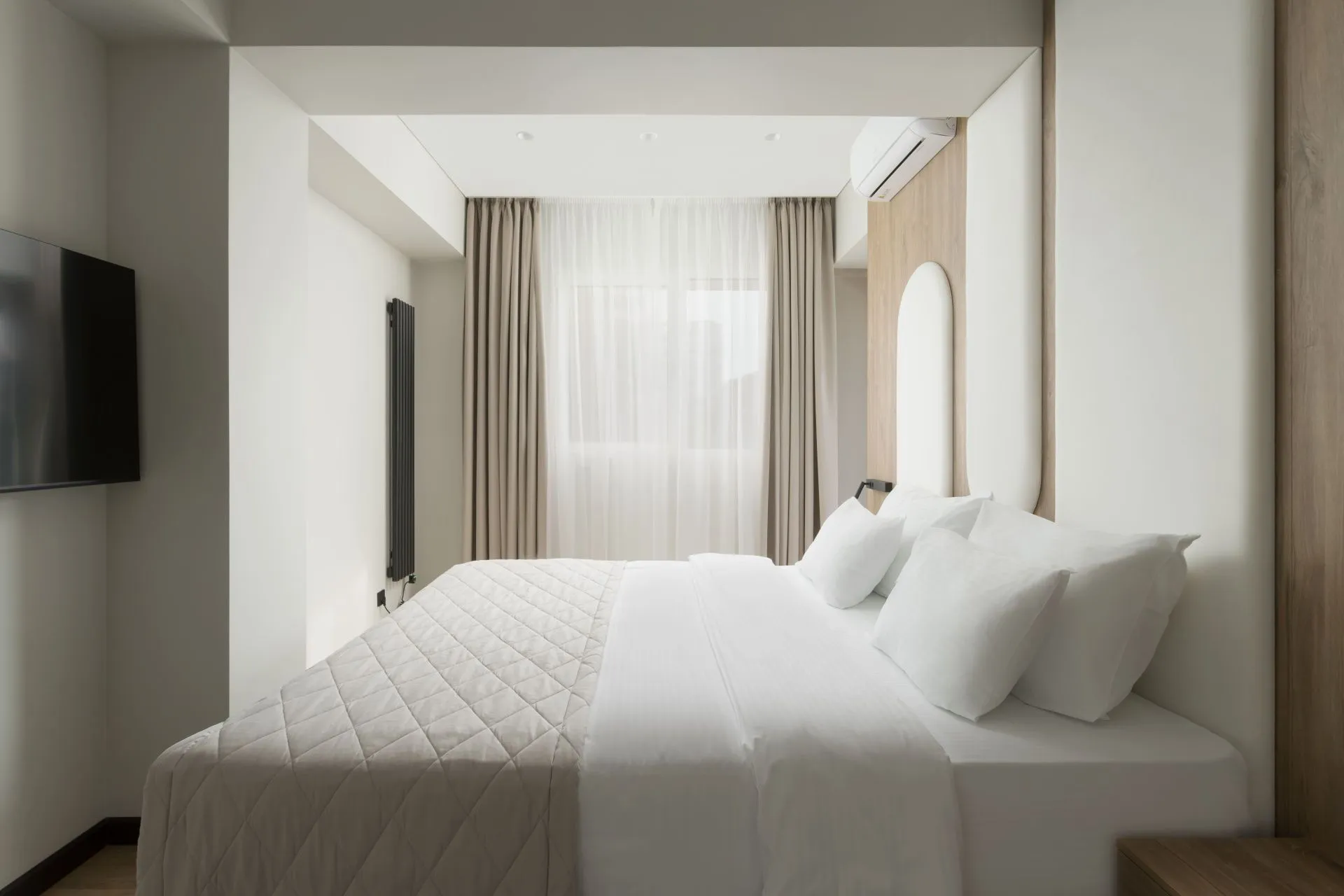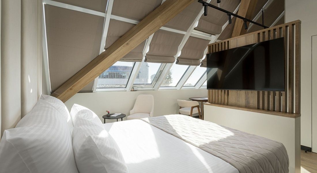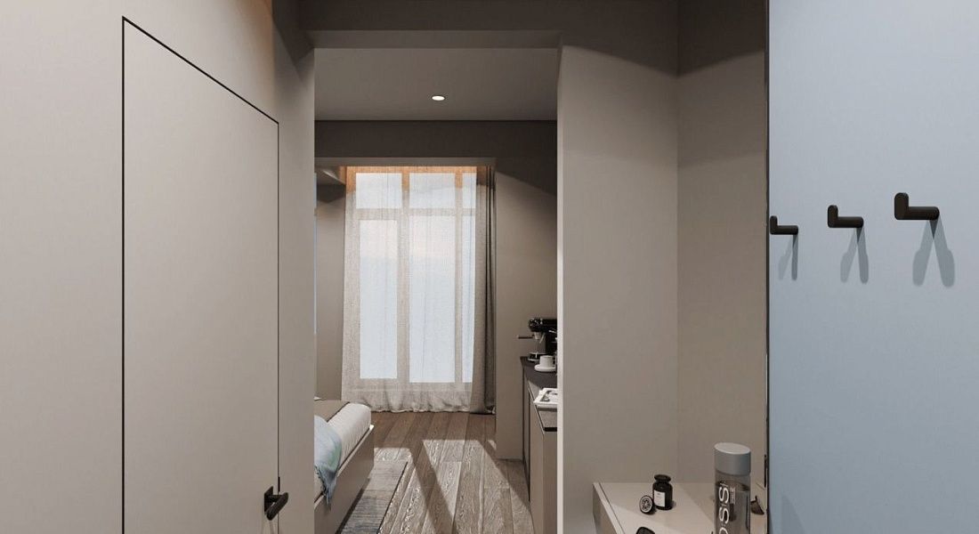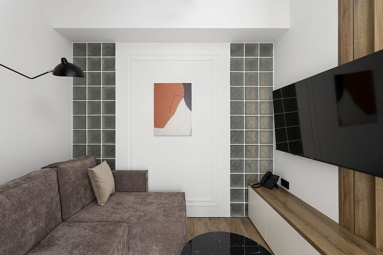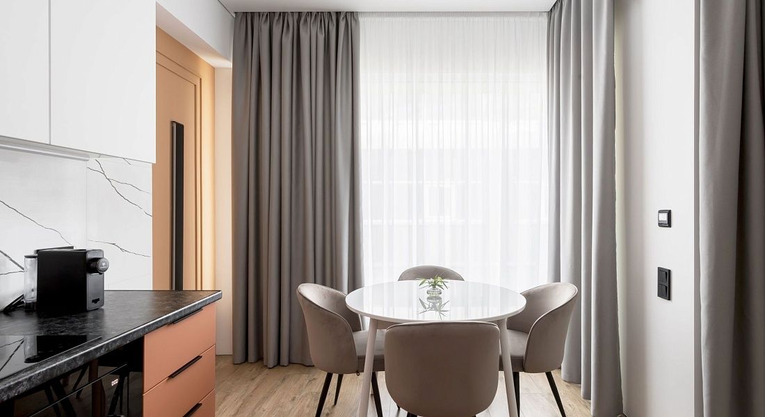 A bright room for 2 guests with a zoning partition between the bedroom and the living area. With a fully equipped kitchen.