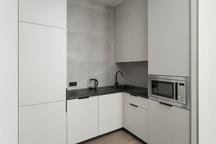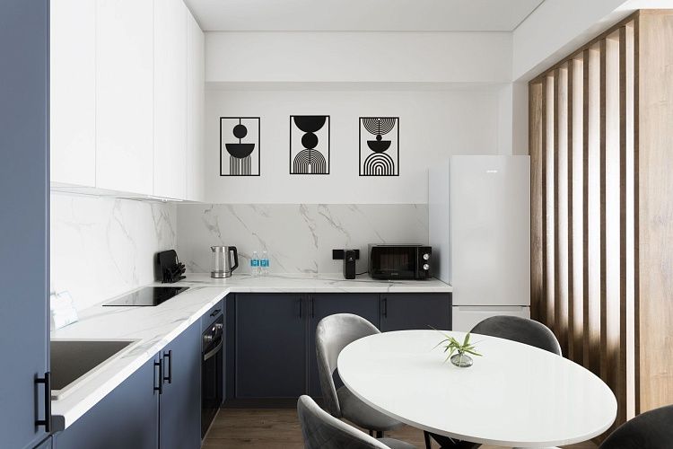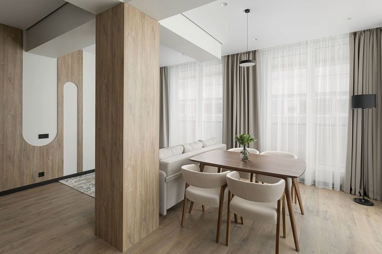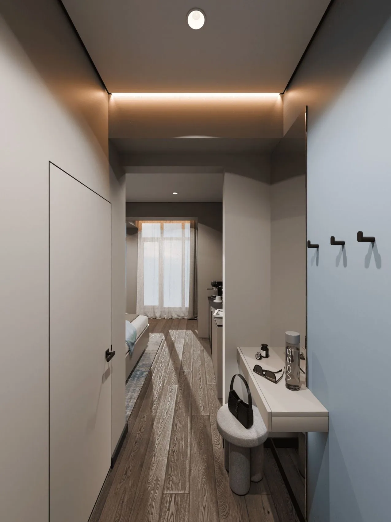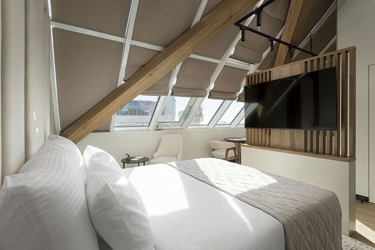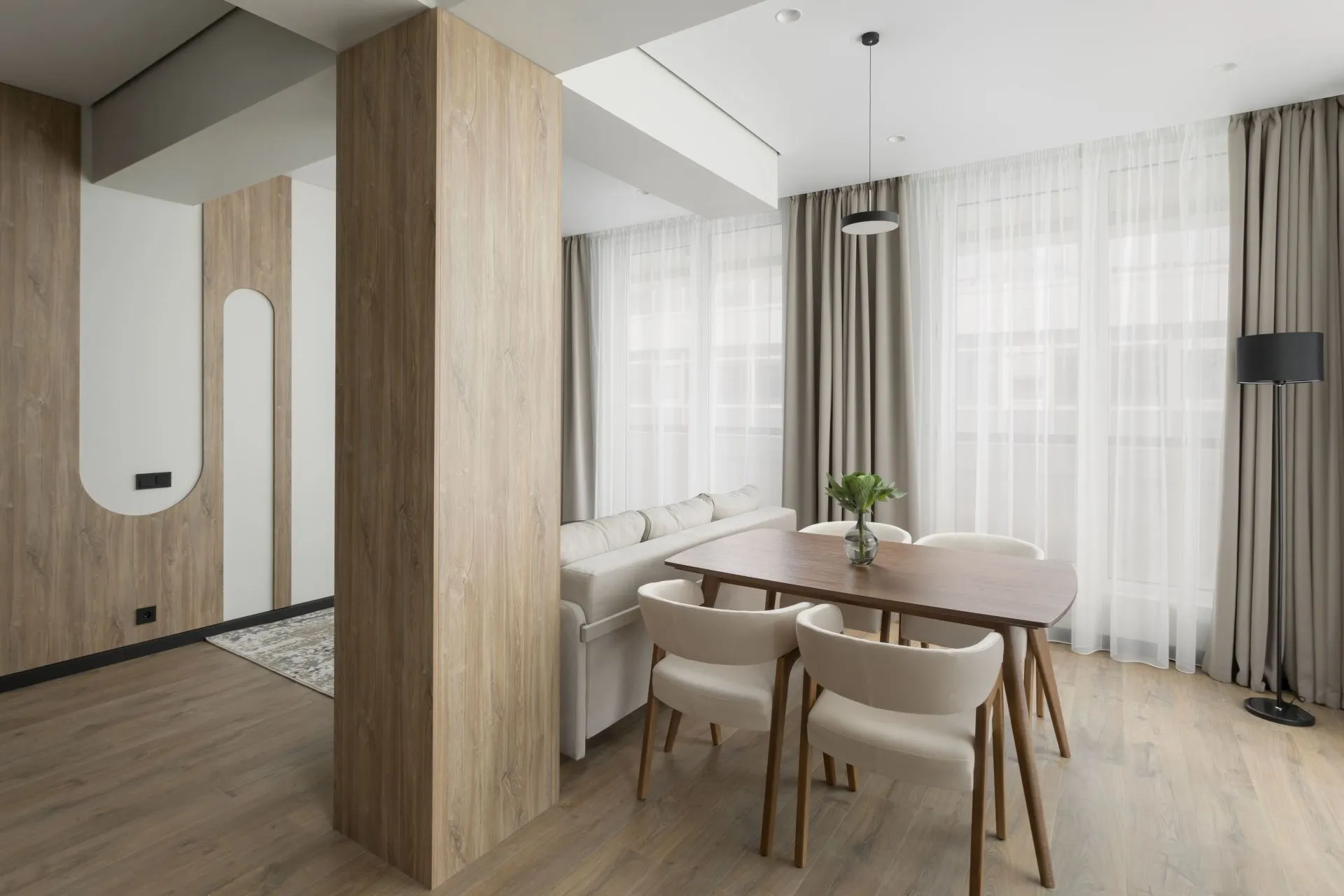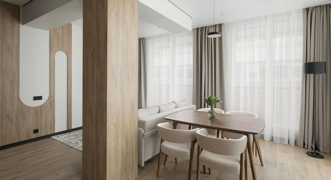 A bright room for 2 guests with a zoning partition between the bedroom and the living area. With a fully equipped kitchen.