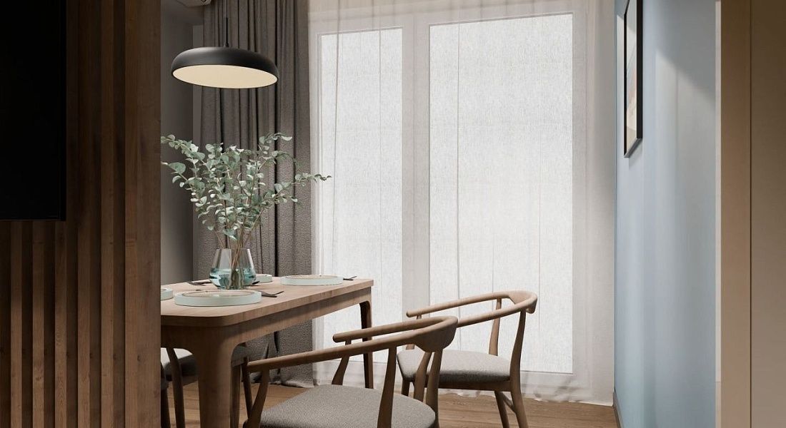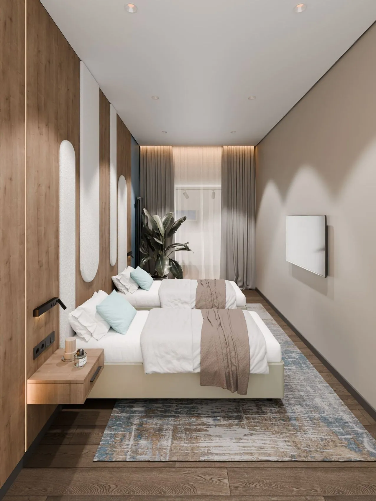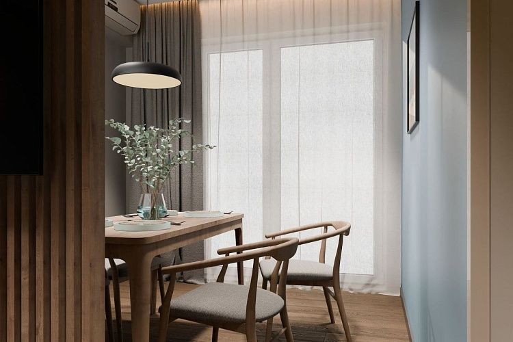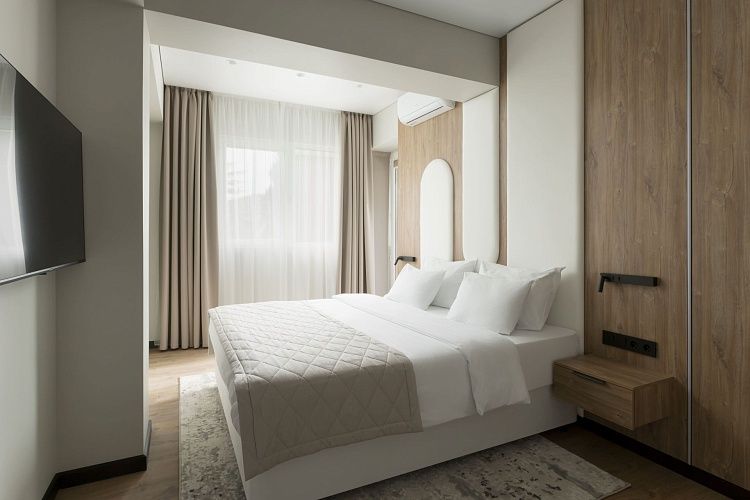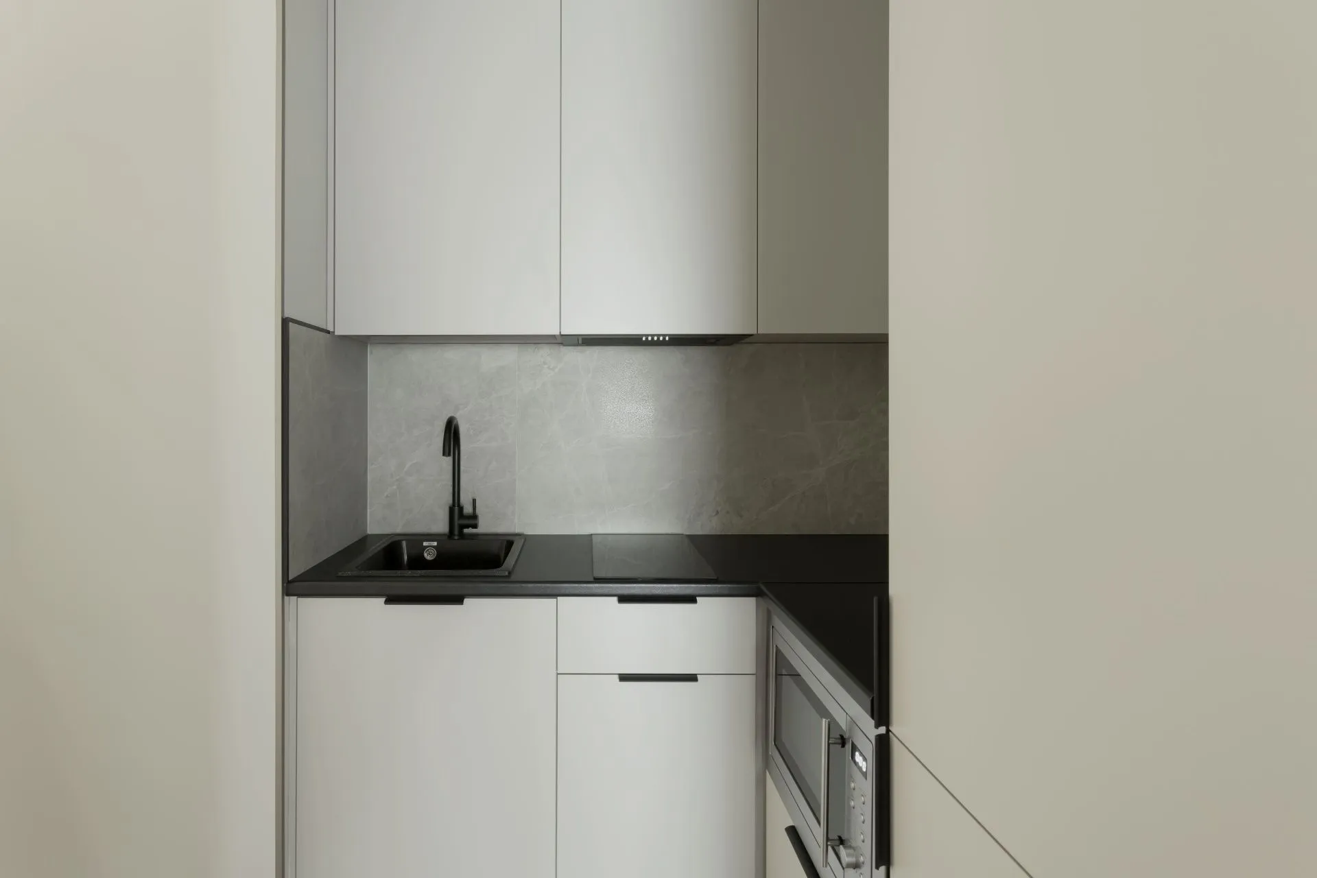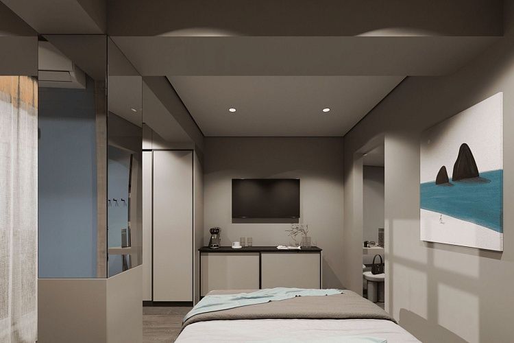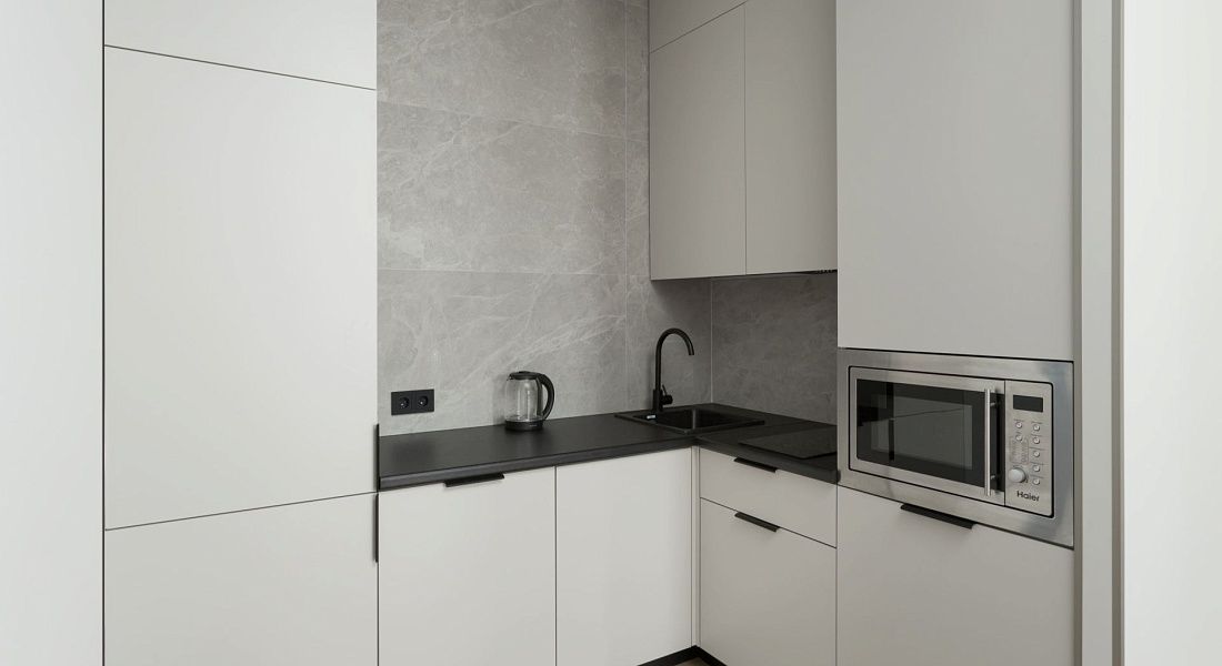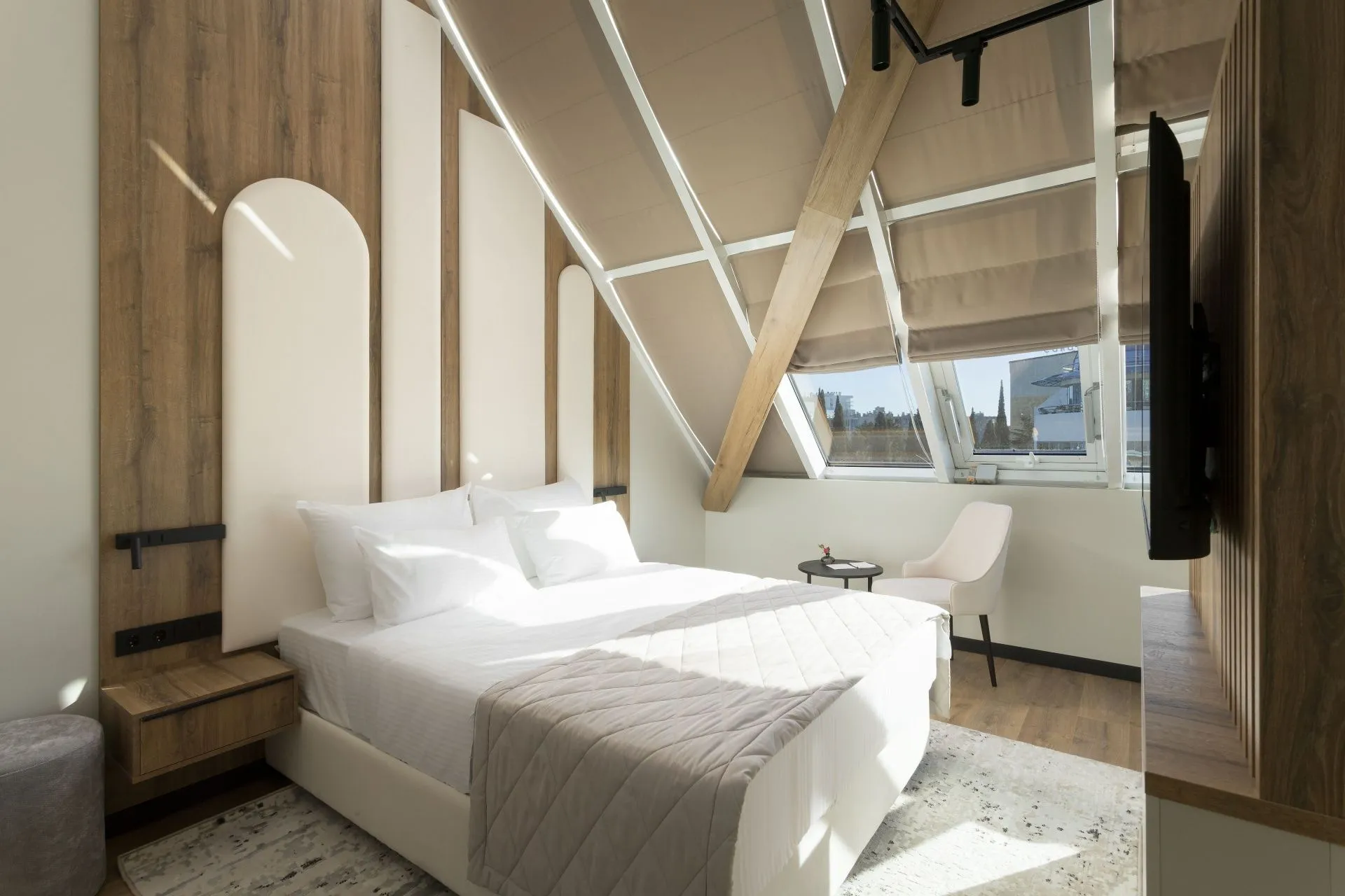 A bright room for 2 guests with a zoning partition between the bedroom and the living area. With a fully equipped kitchen.