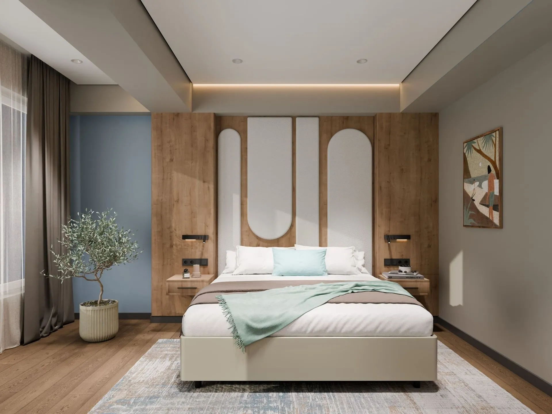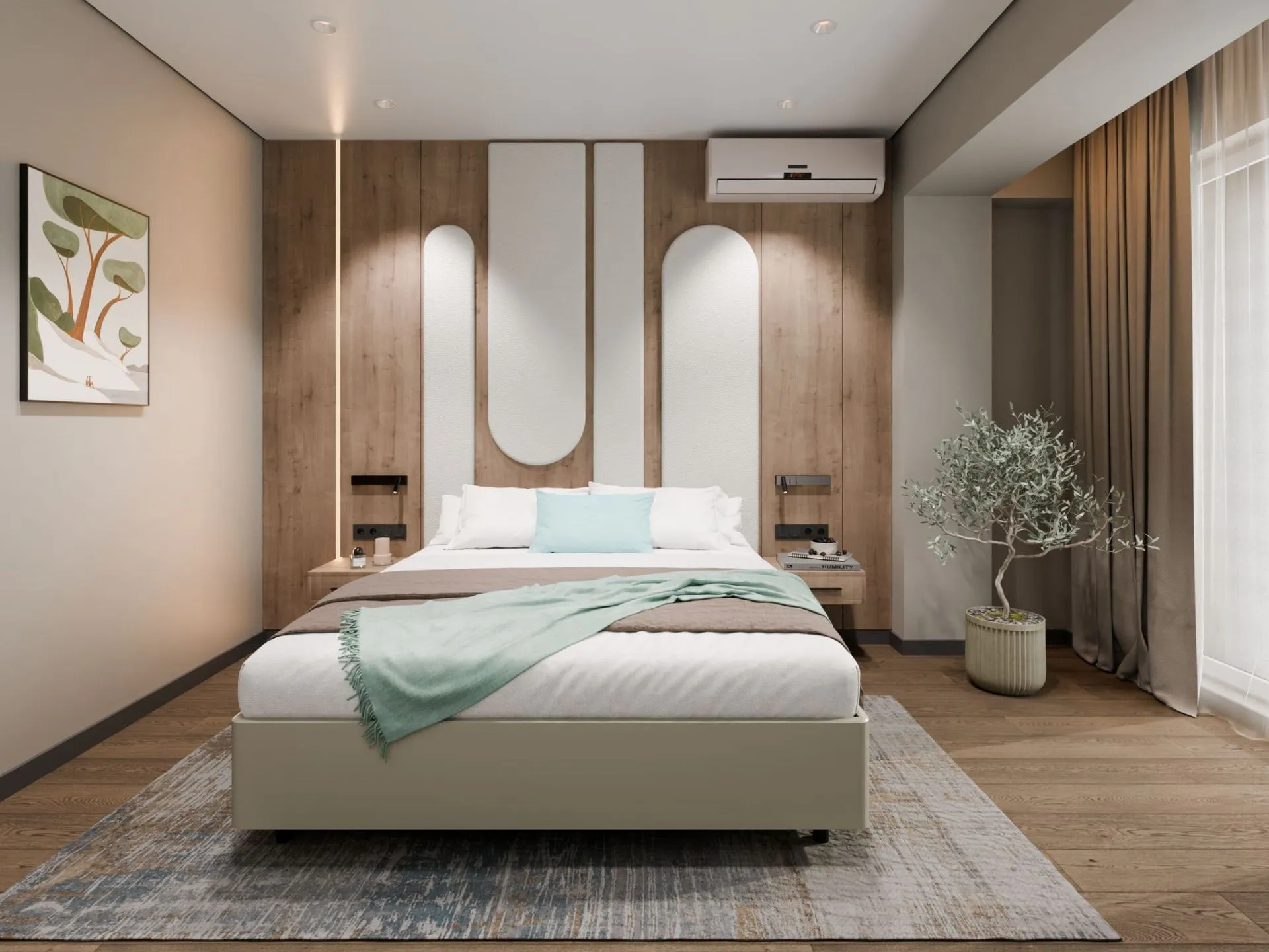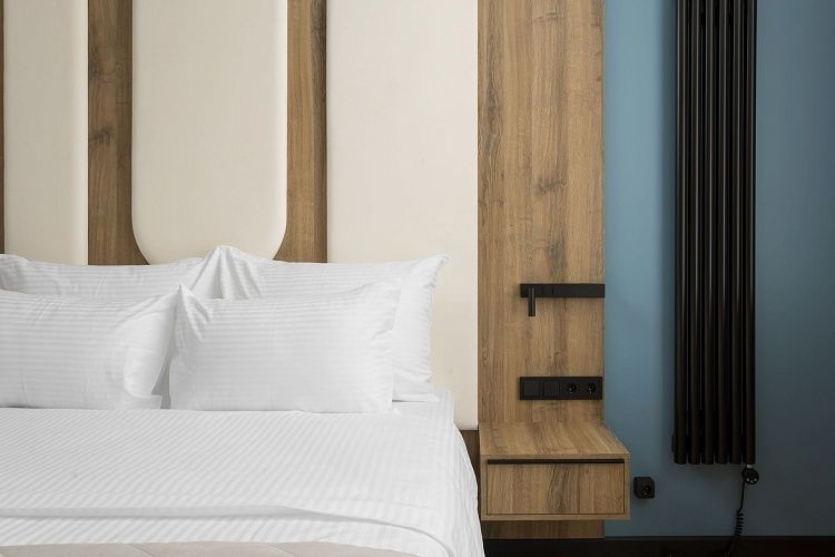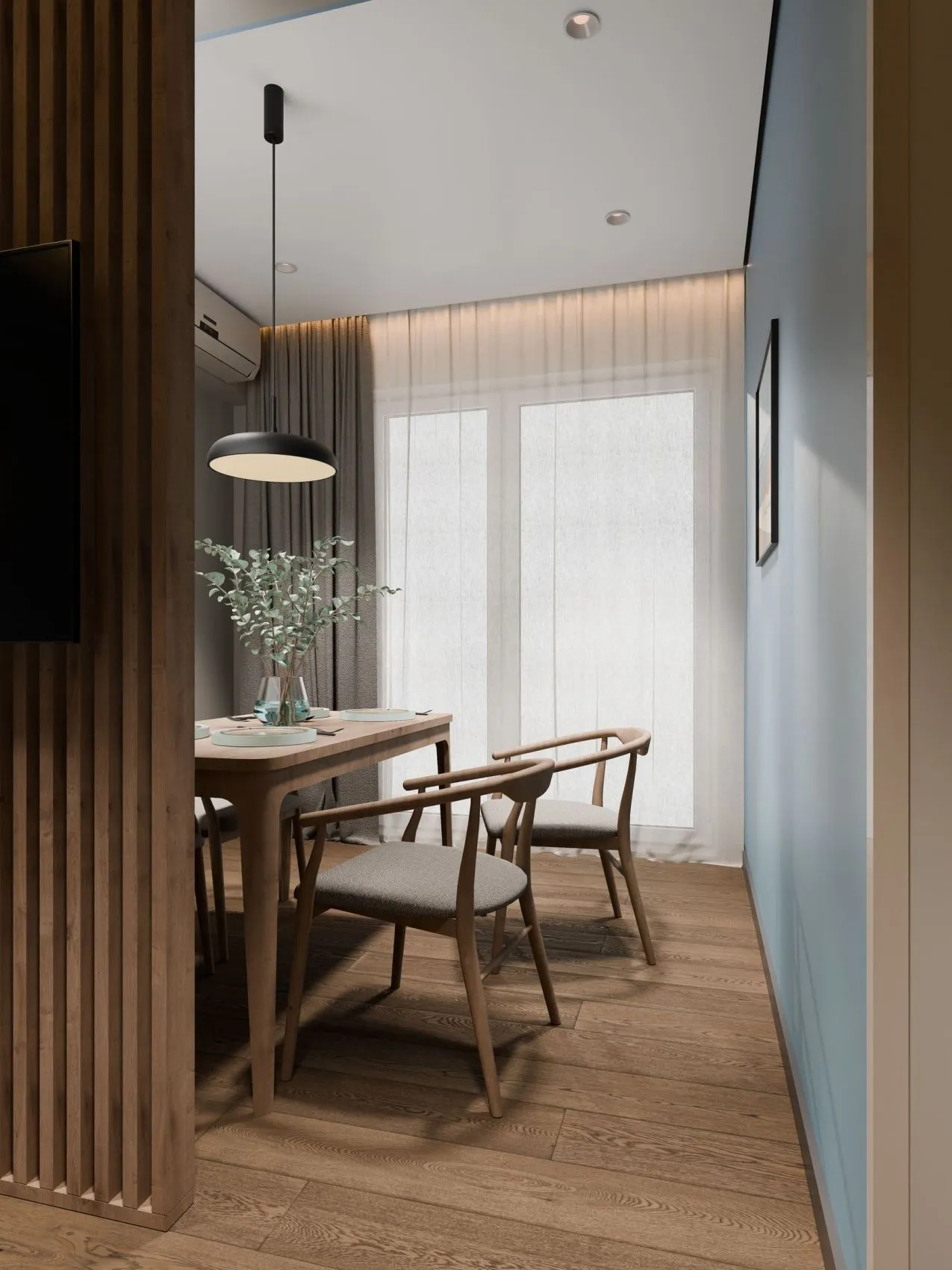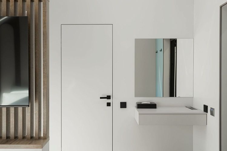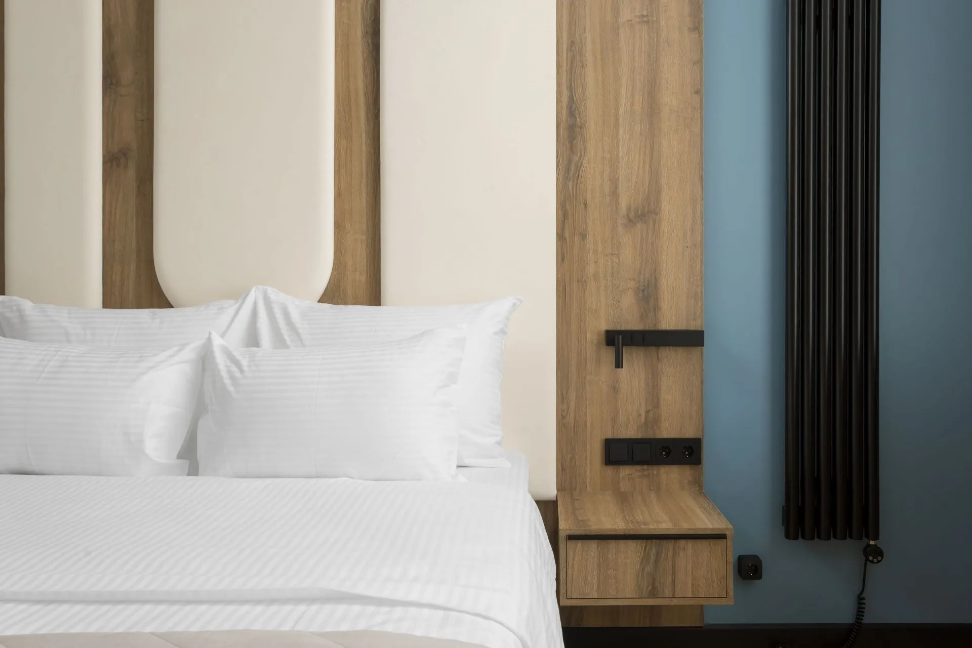 A bright room for 2 guests with a zoning partition between the bedroom and the living area. With a fully equipped kitchen.