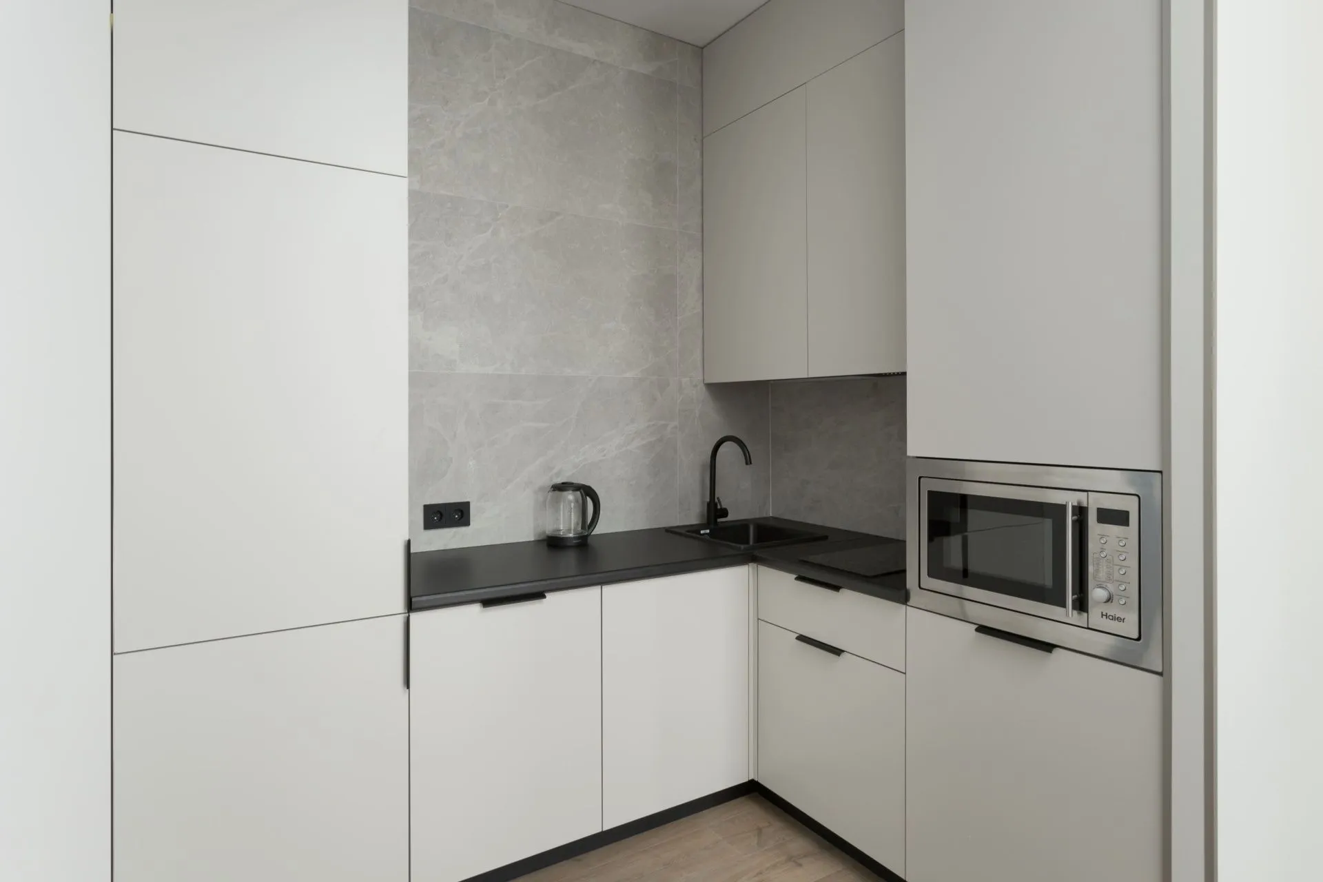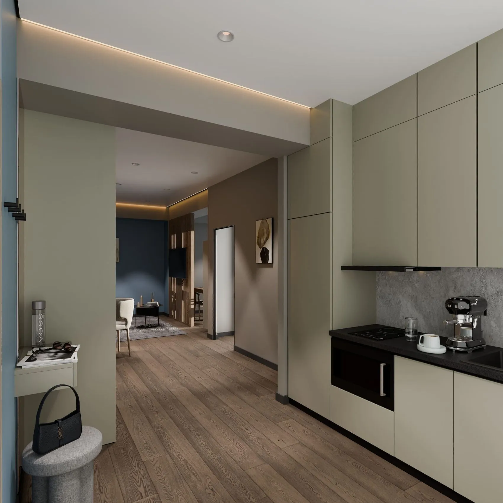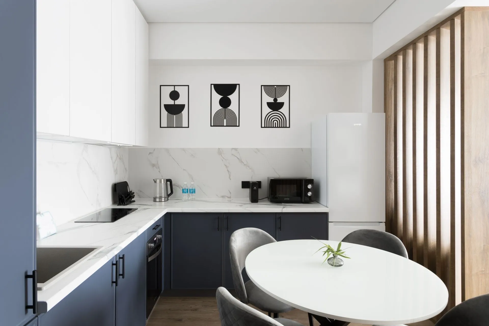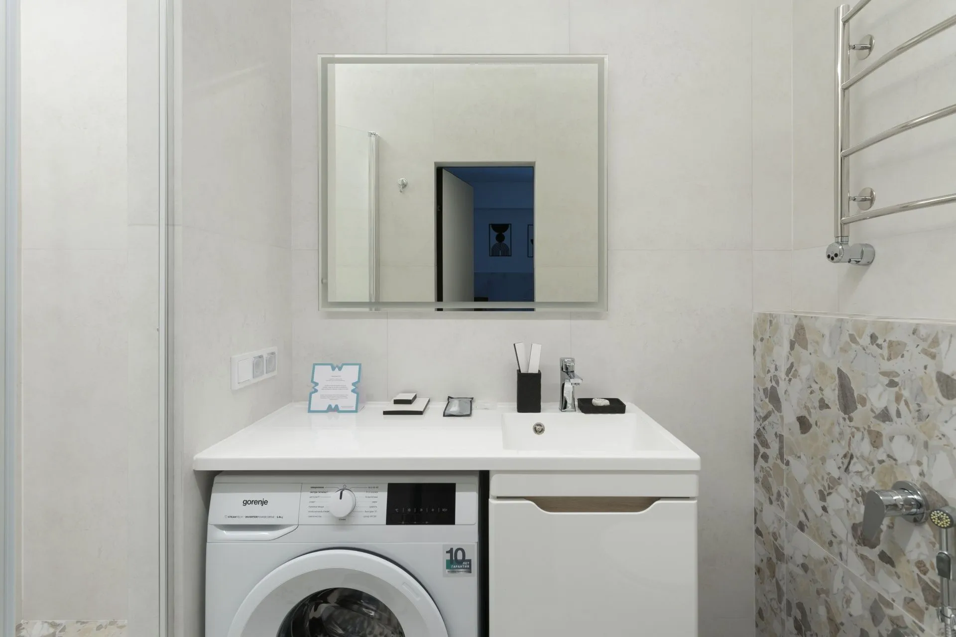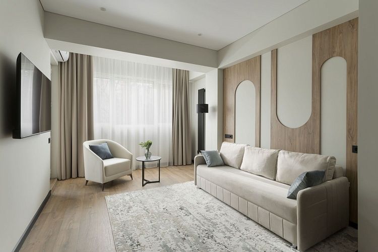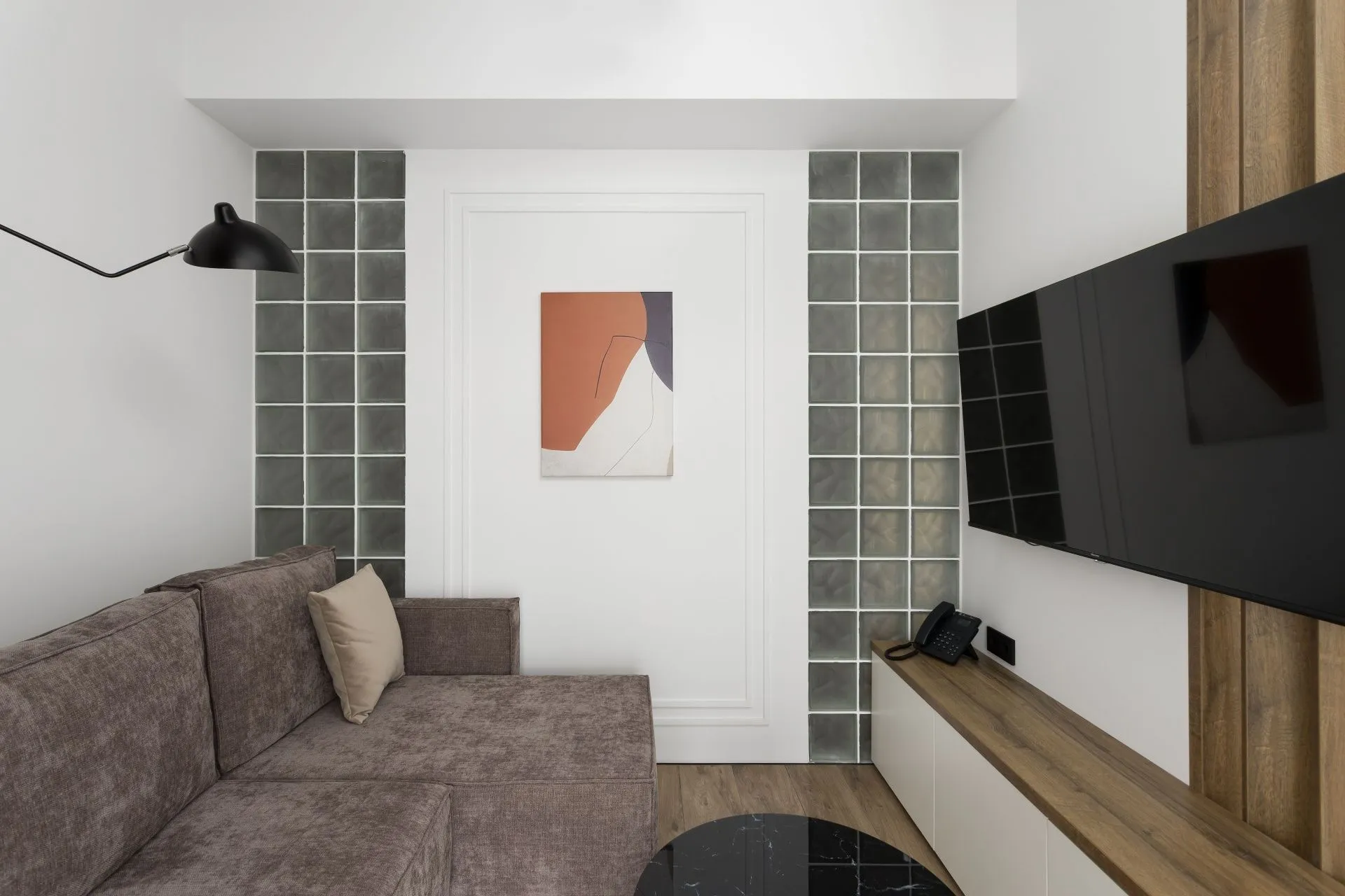 Spacious 2-room suite with a cozy living room, separate bedroom, fully equipped kitchen, and shower cabin.