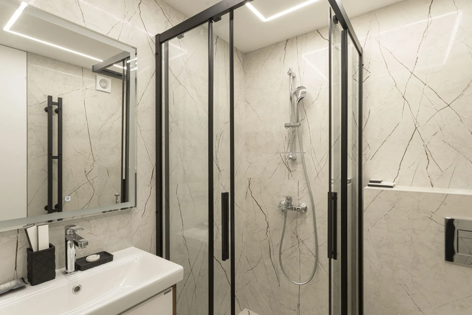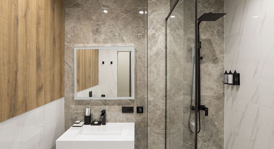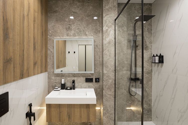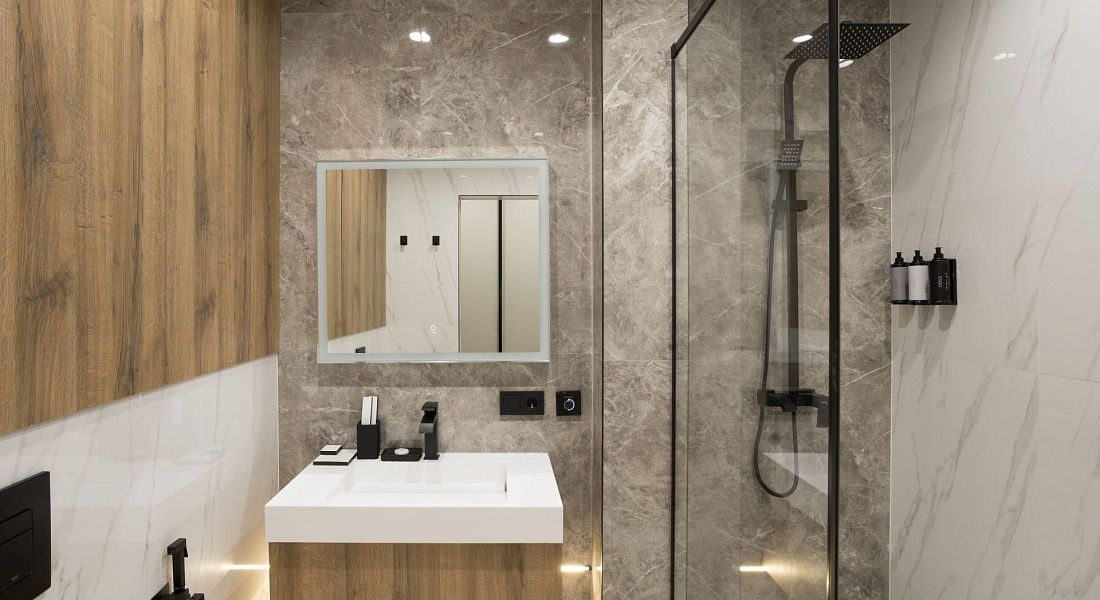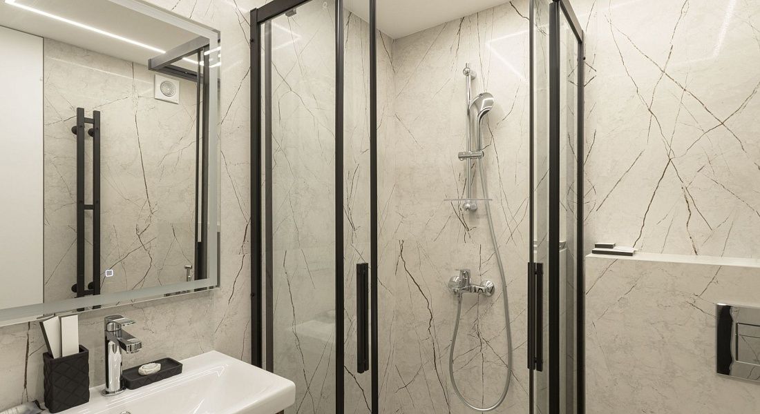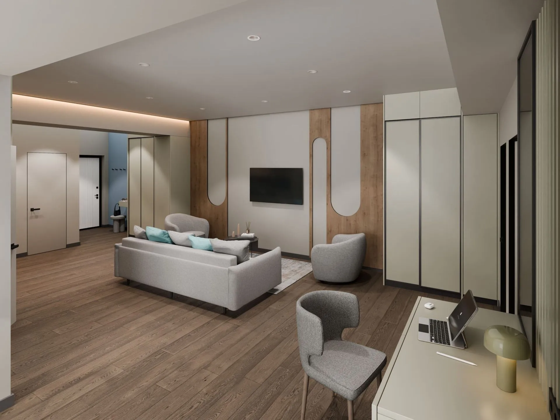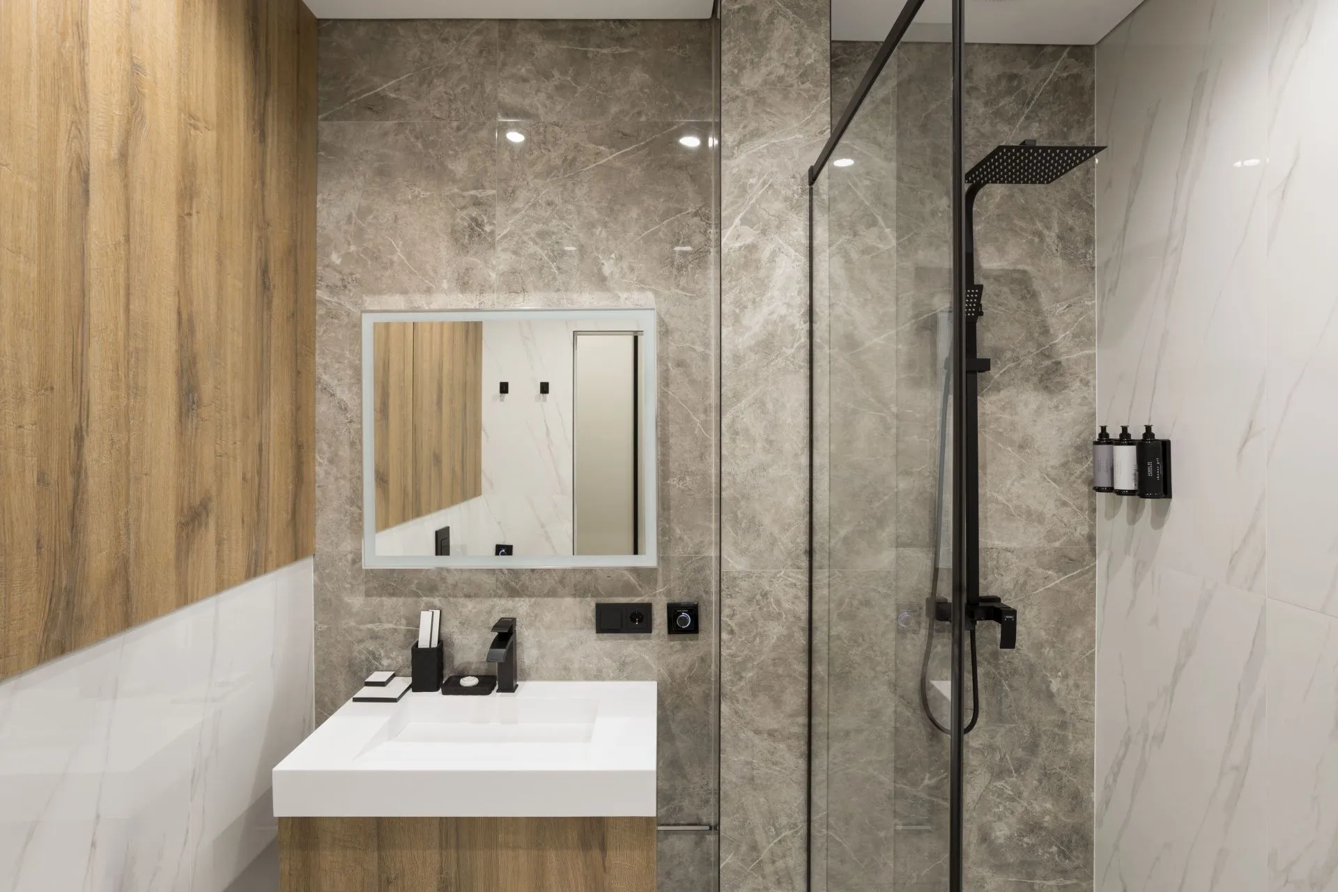 Spacious 2-room suite with a cozy living room, separate bedroom, fully equipped kitchen, and shower cabin.
