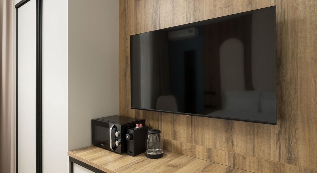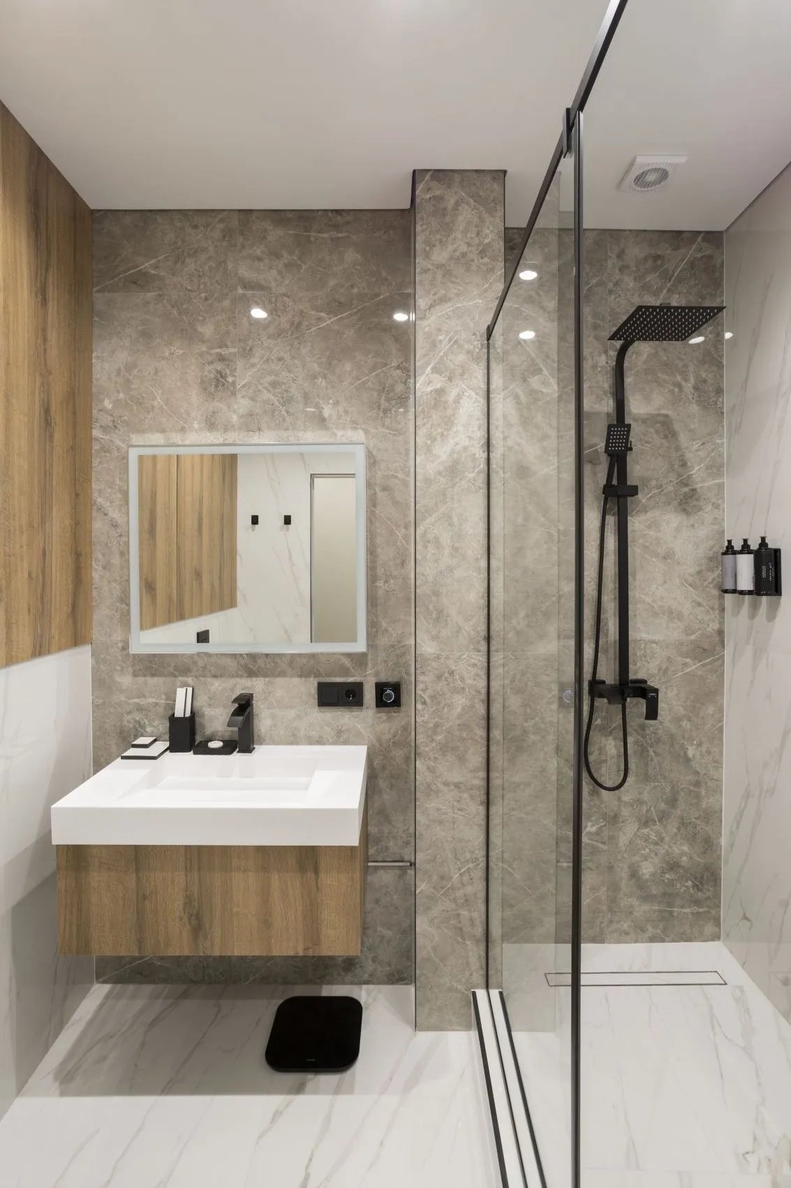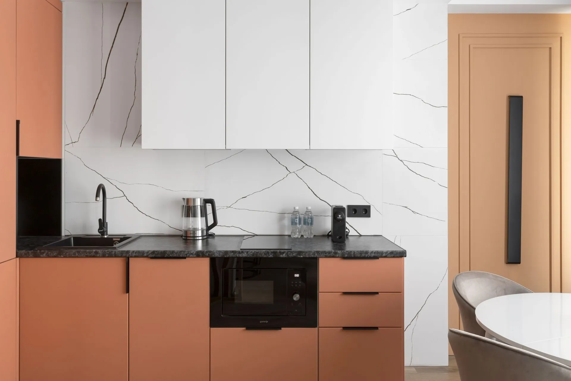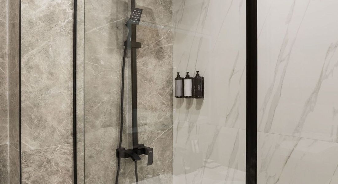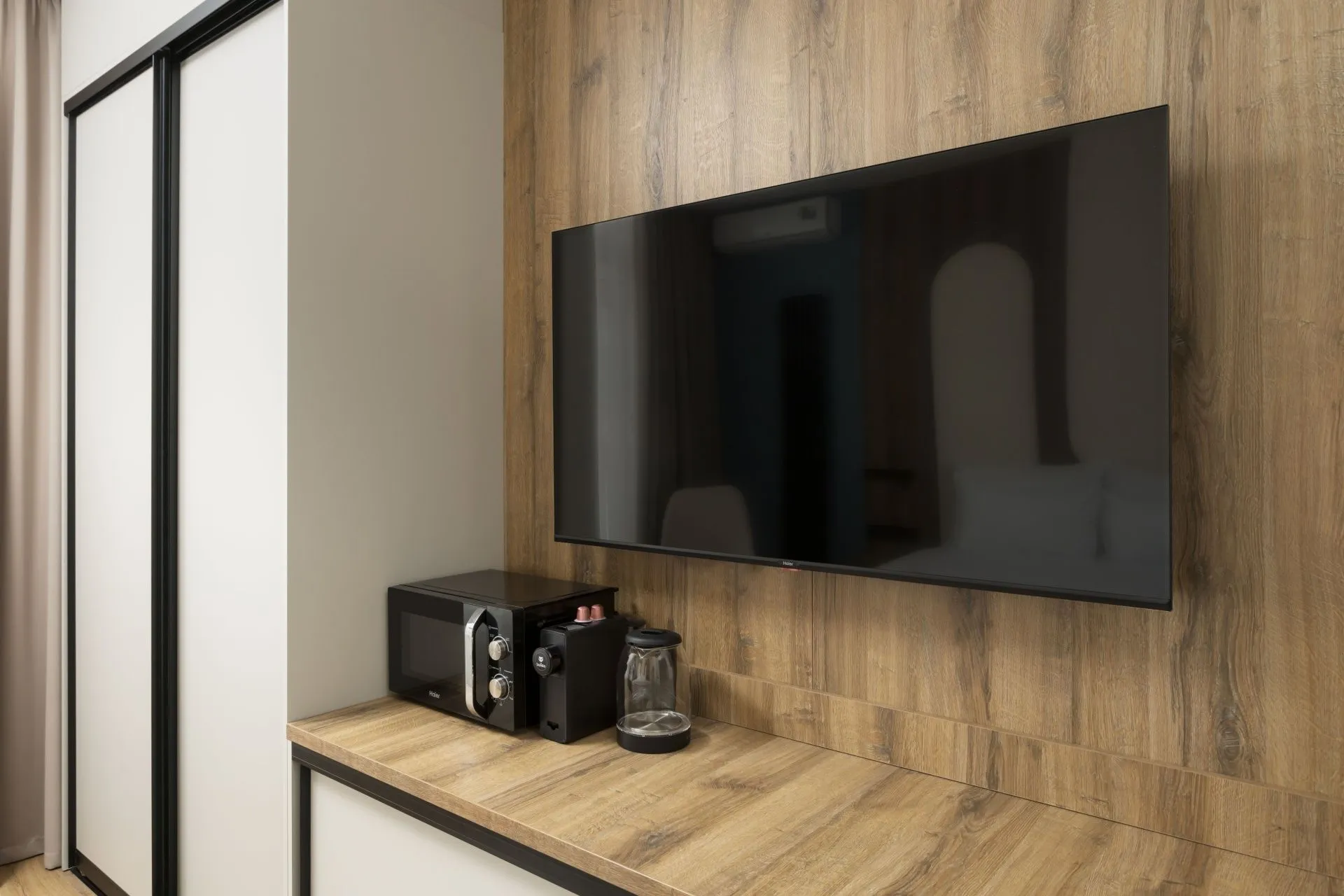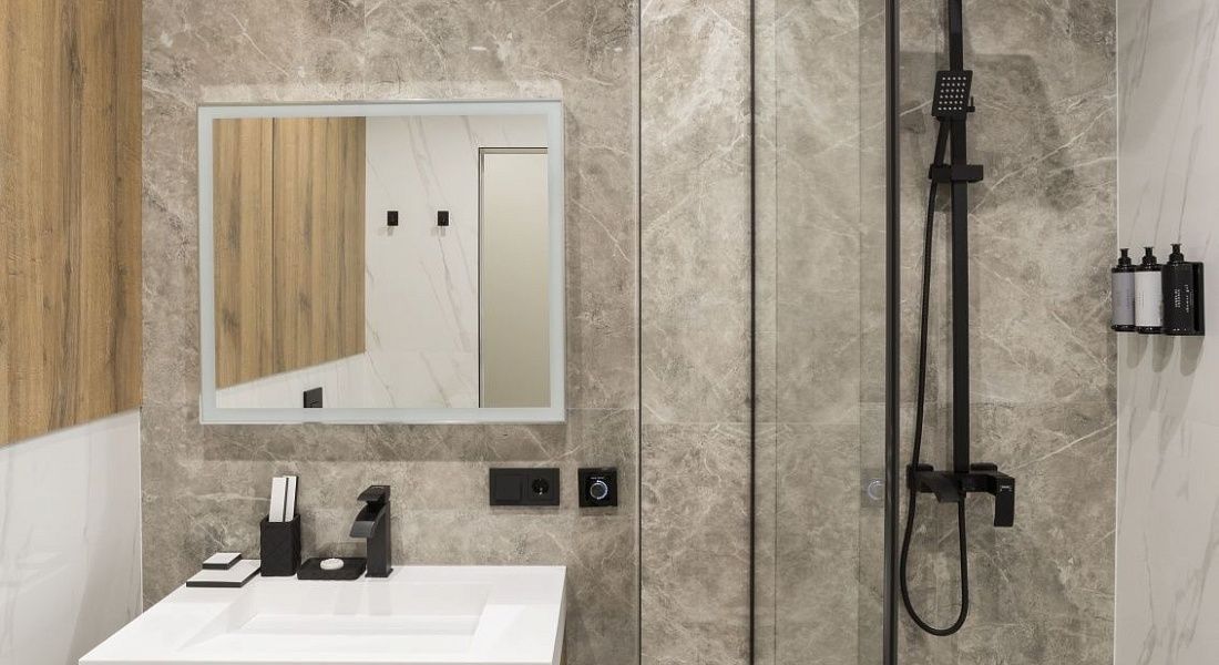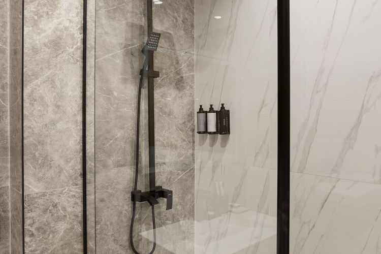 Spacious 2-room suite with a cozy living room, separate bedroom, fully equipped kitchen, and shower cabin.
