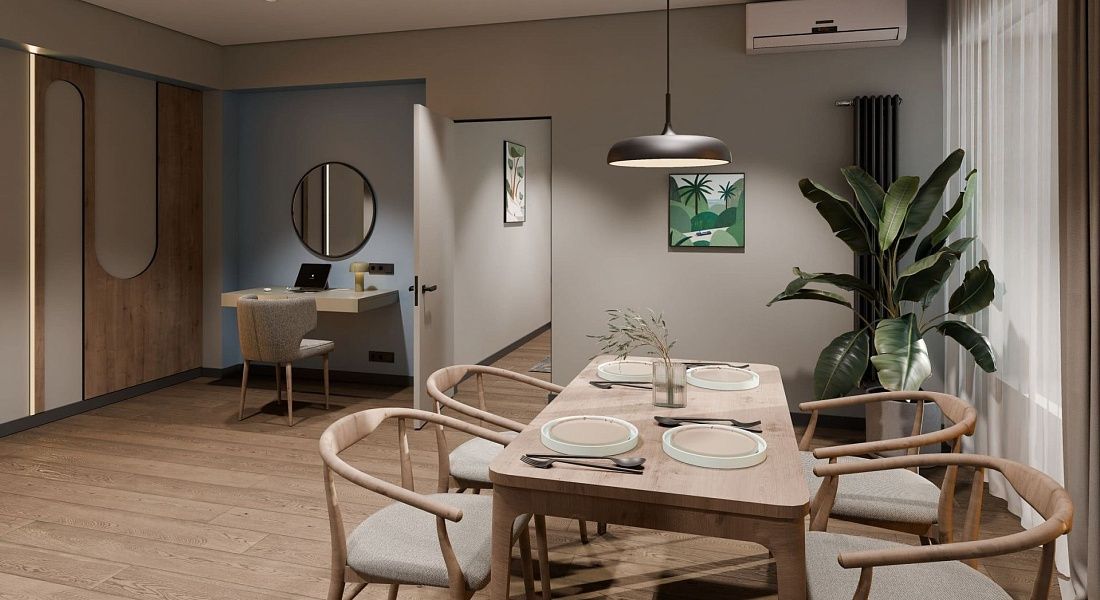 Spacious 3-room suite with two bedrooms, an equipped kitchen, and a large balcony-terrace with furniture.