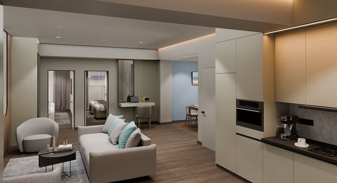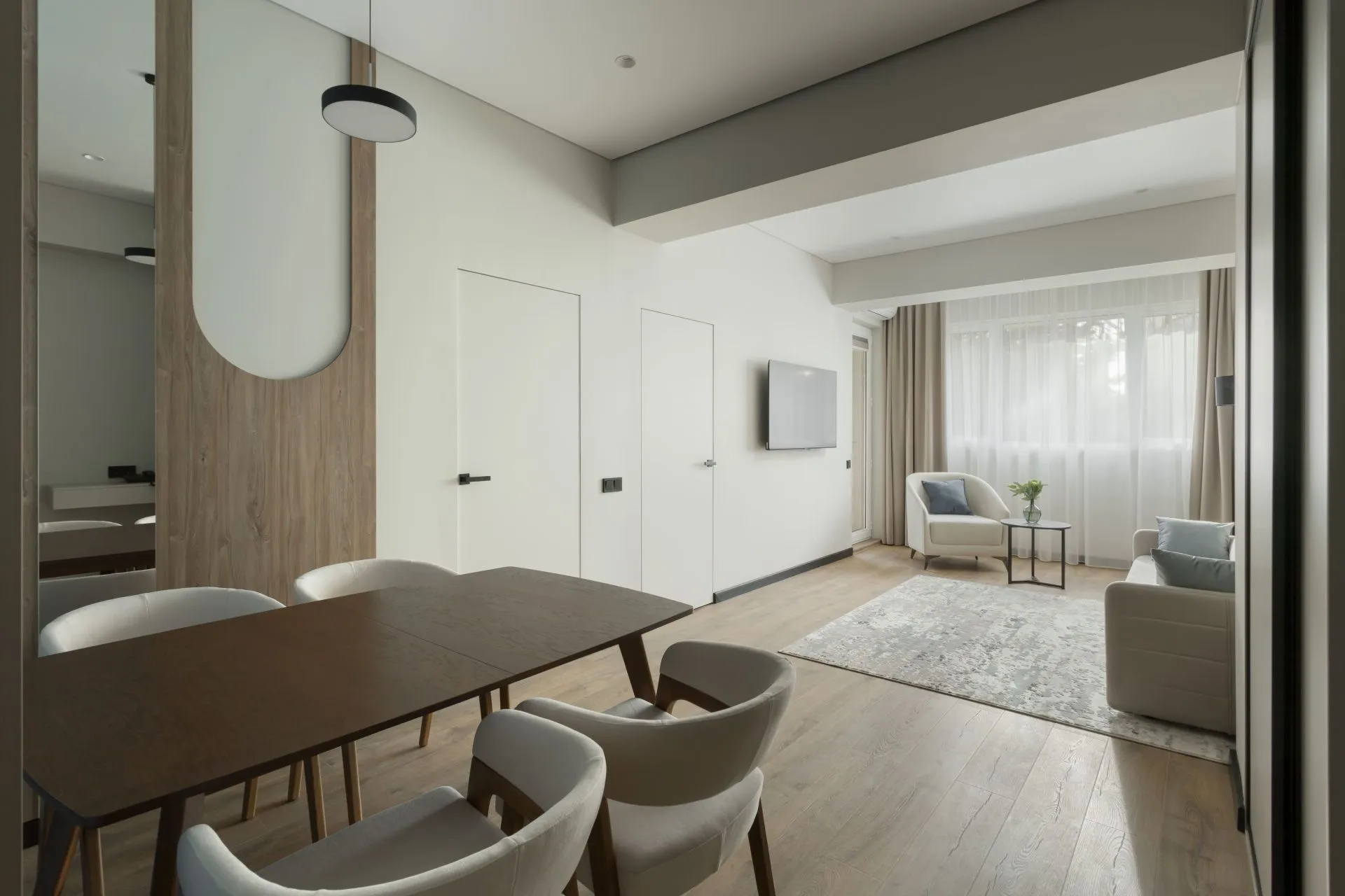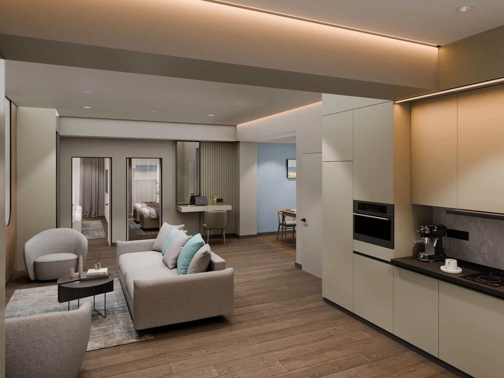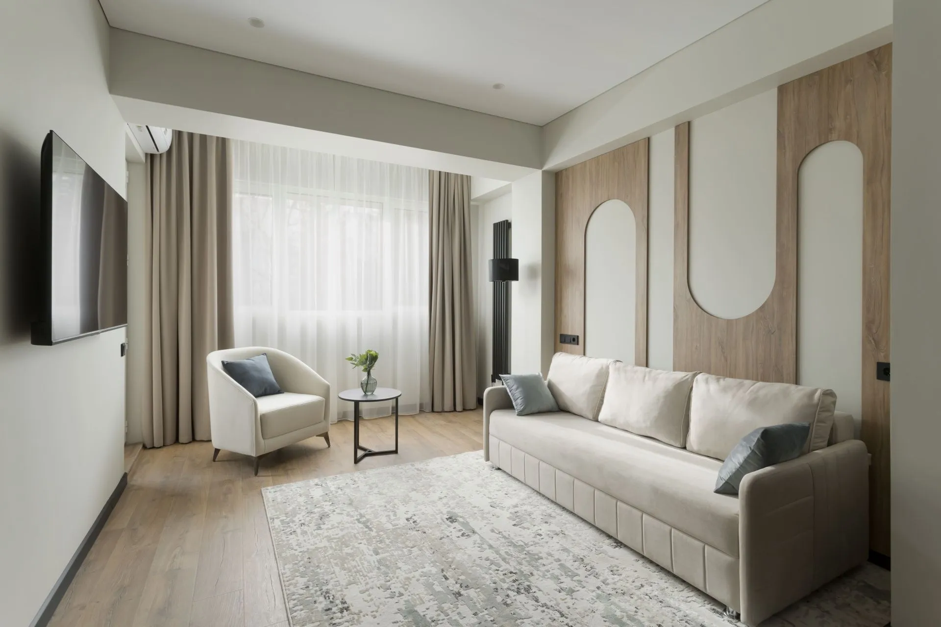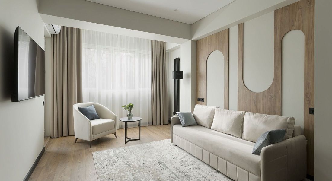 Spacious 2-room suite with two separate rooms: a bedroom and a living room. Fully equipped kitchen.