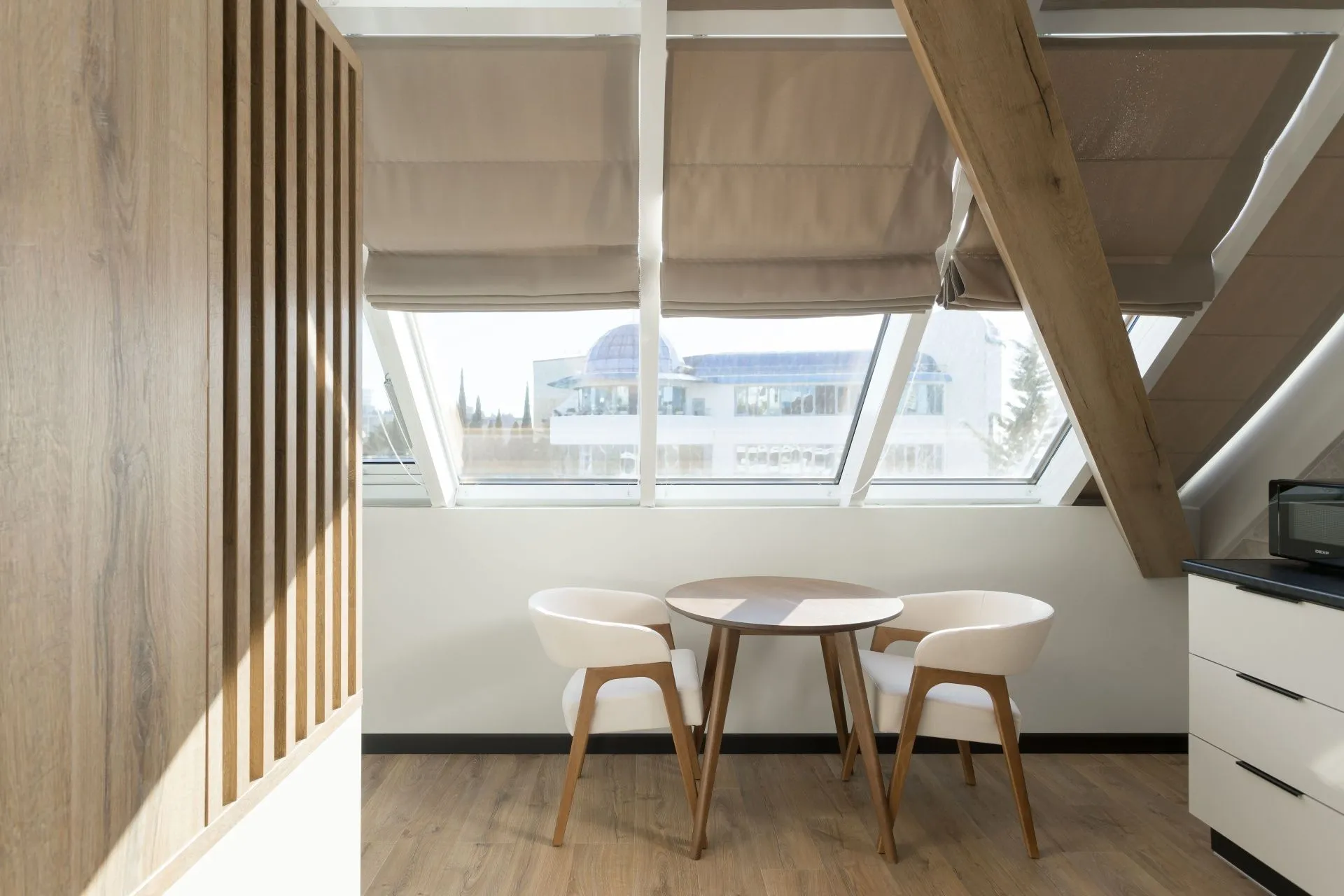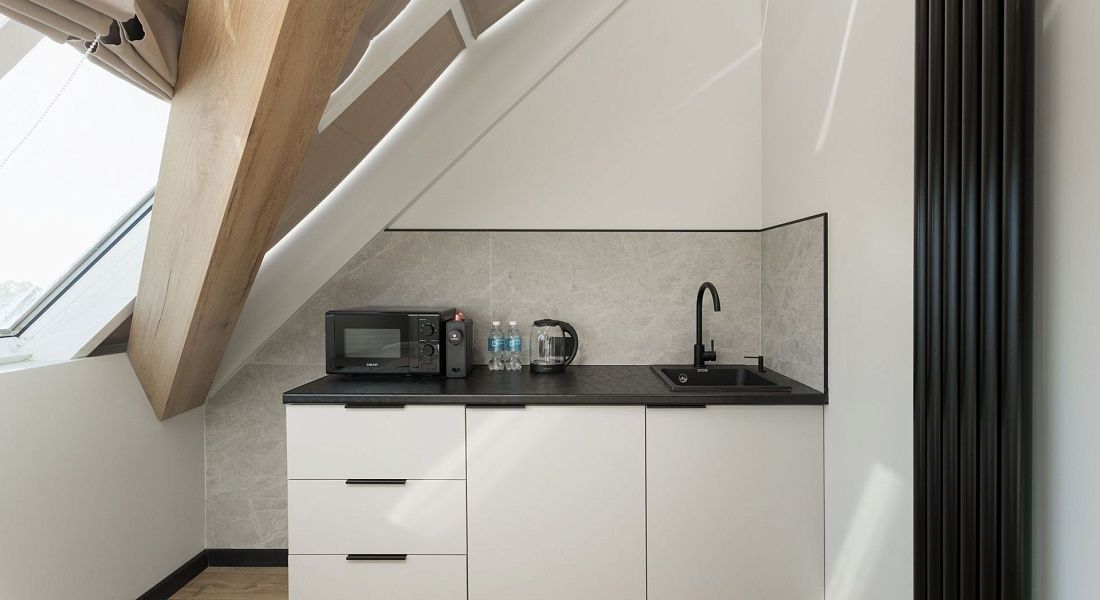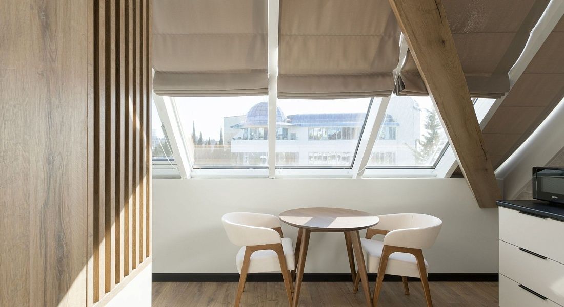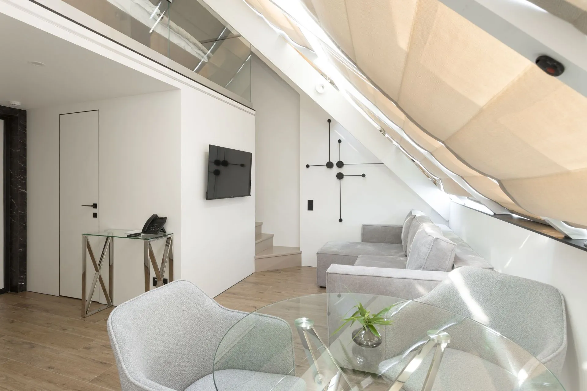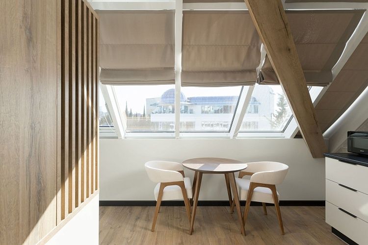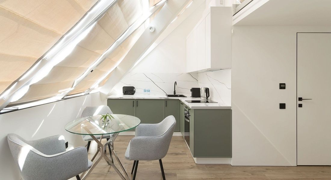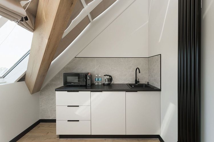 Duplex apartment for 2–3 people with a living room and equipped kitchen, upstairs bedroom, and shower room with washing machine. No balcony. Dormer windows overlook the city.