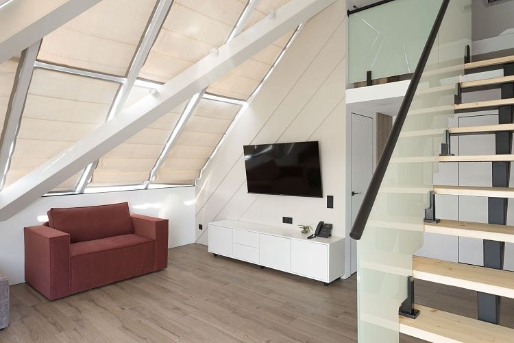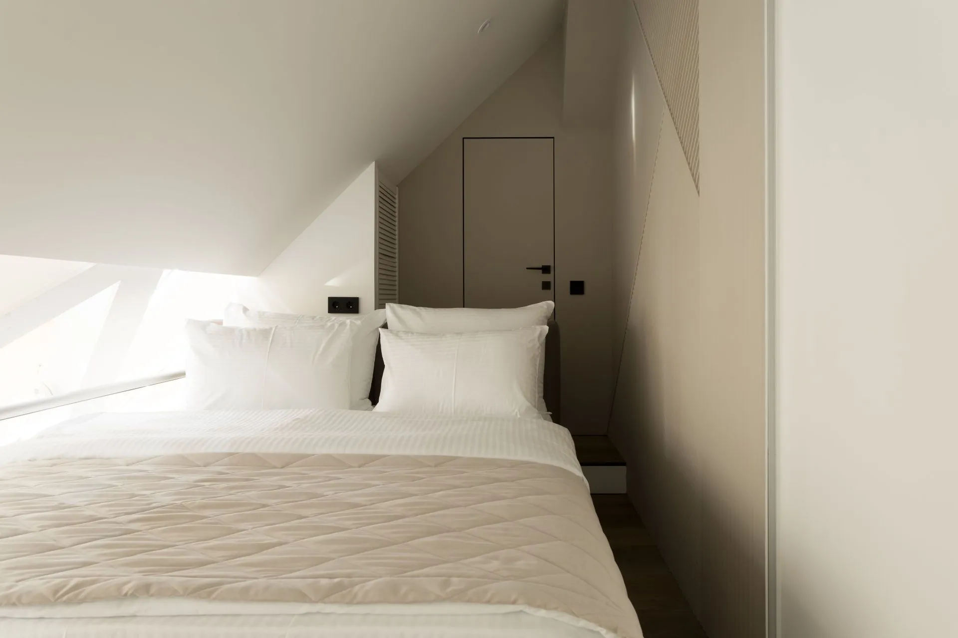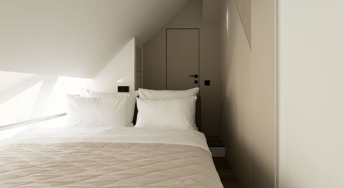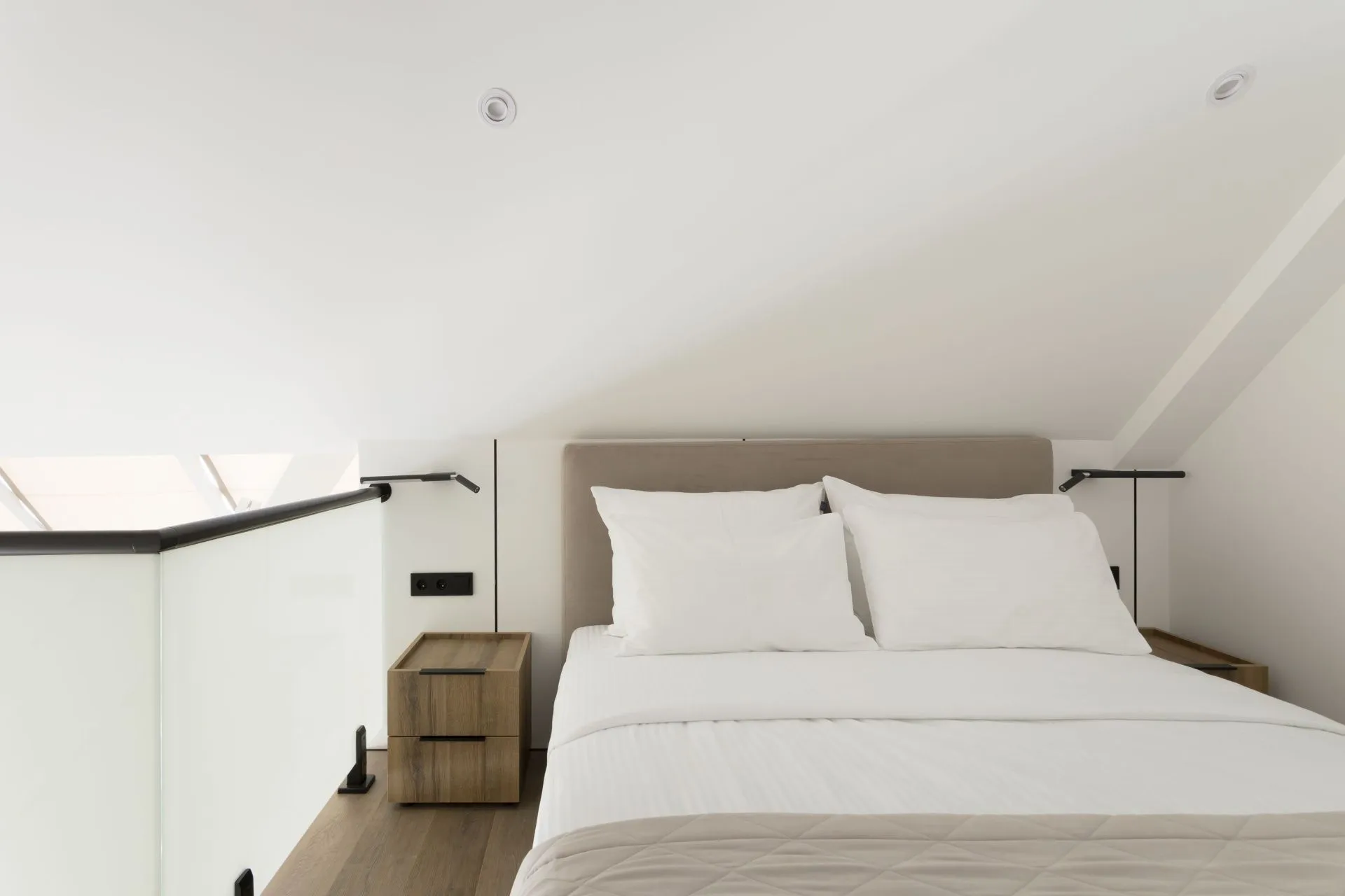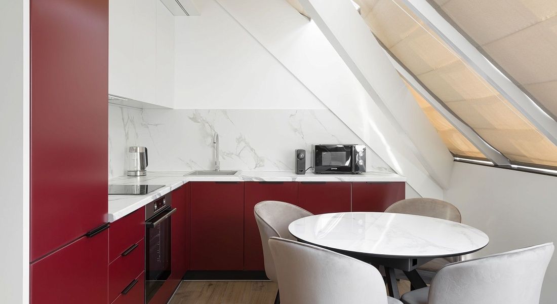 Duplex apartment for 2–3 people with a living room and equipped kitchen, upstairs bedroom, and shower room with washing machine. No balcony. Dormer windows overlook the city.
