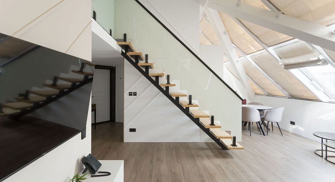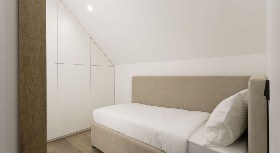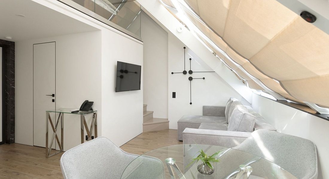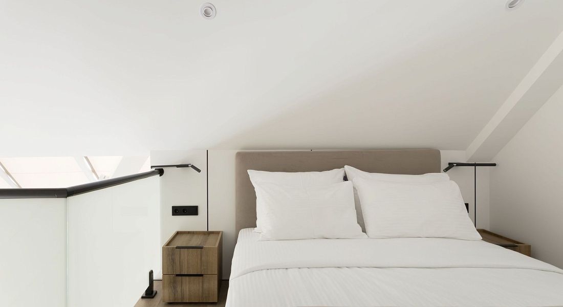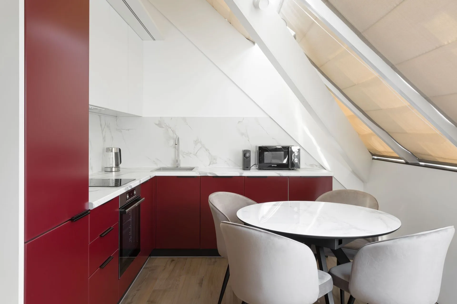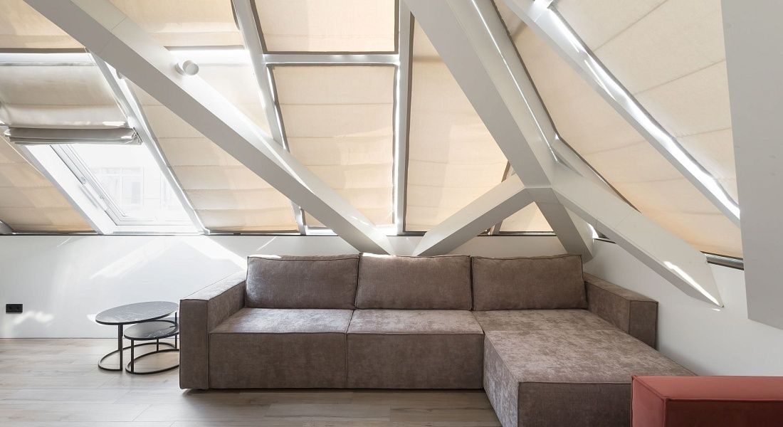 Duplex apartment for 2–3 people with a living room and equipped kitchen, upstairs bedroom, and shower room with washing machine. No balcony. Dormer windows overlook the city.
