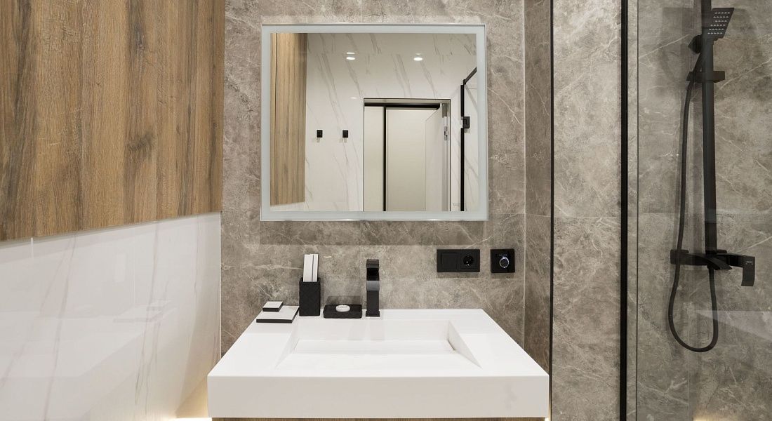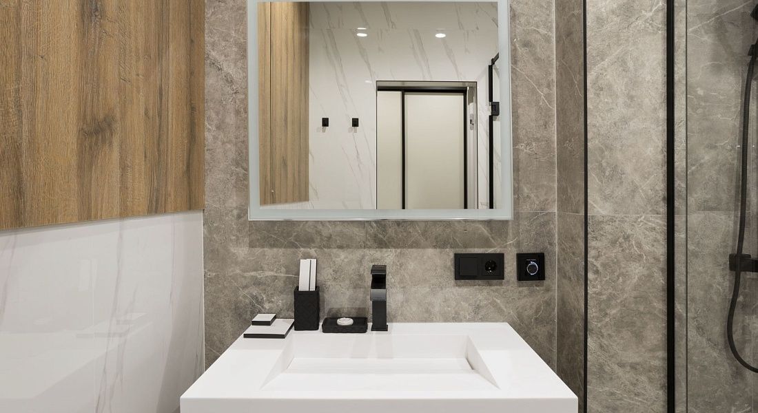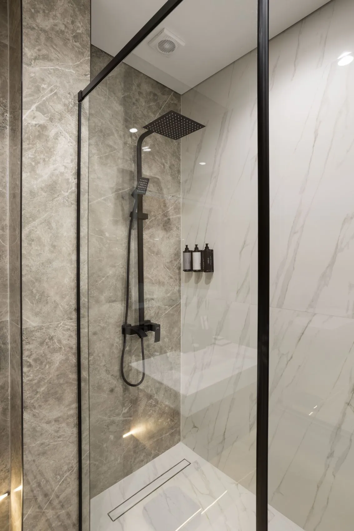 Spacious 3-room suite with a large living room, separate bedrooms, fully equipped kitchen, and shower cabin.